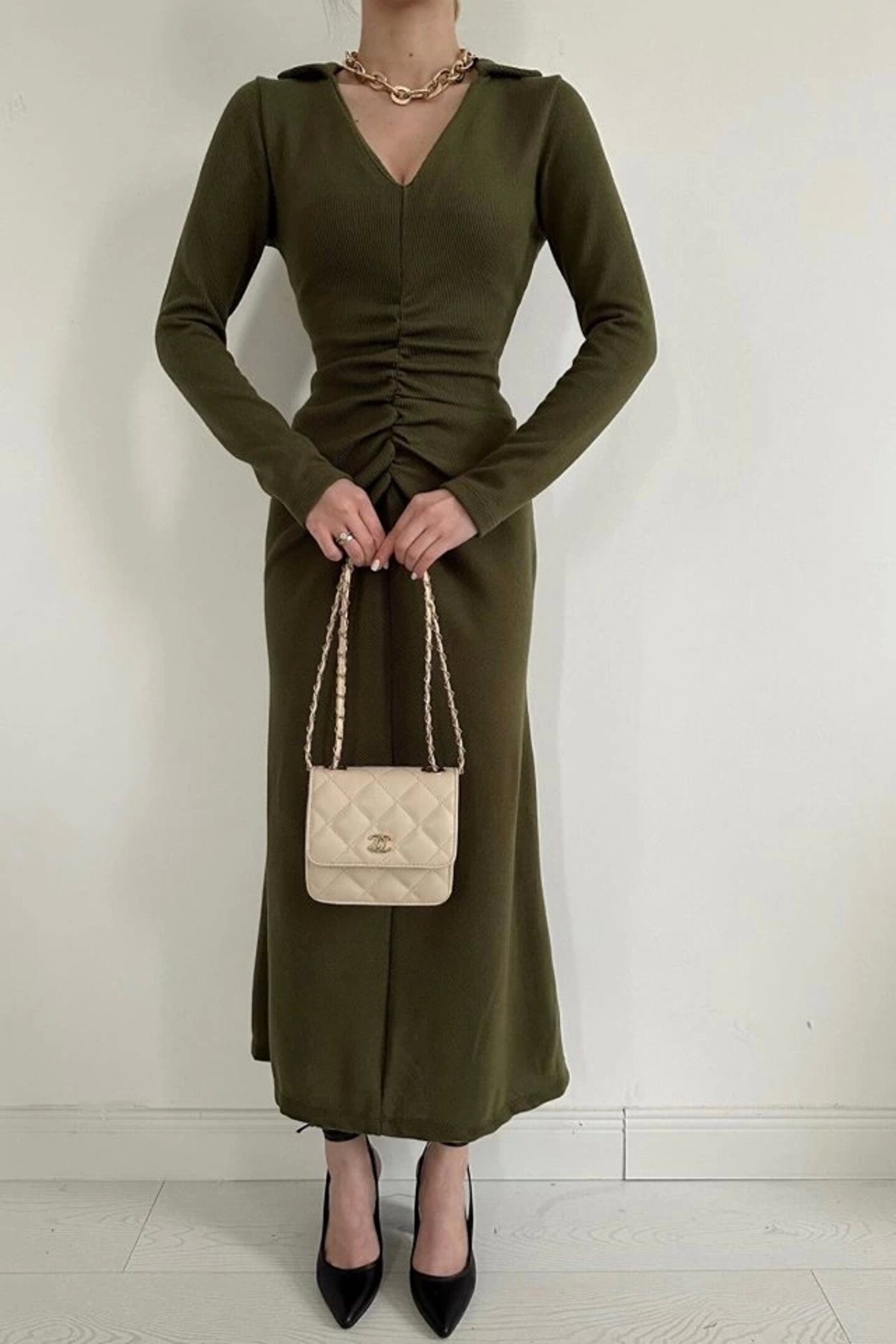 Haki Büzgülü Triko Balık Elbise