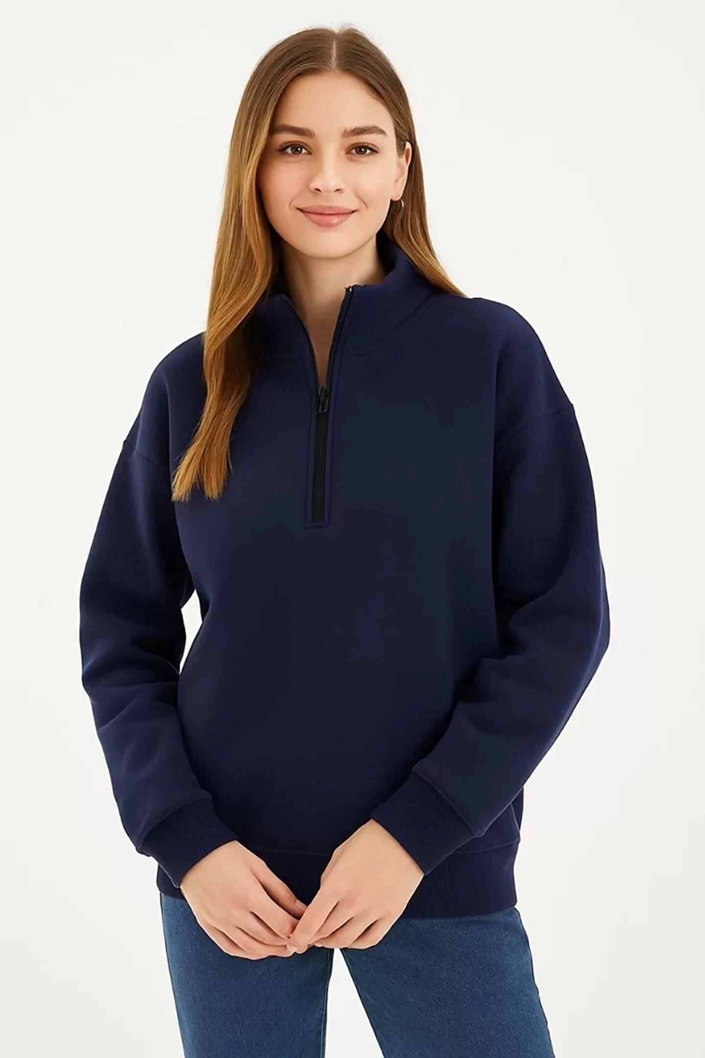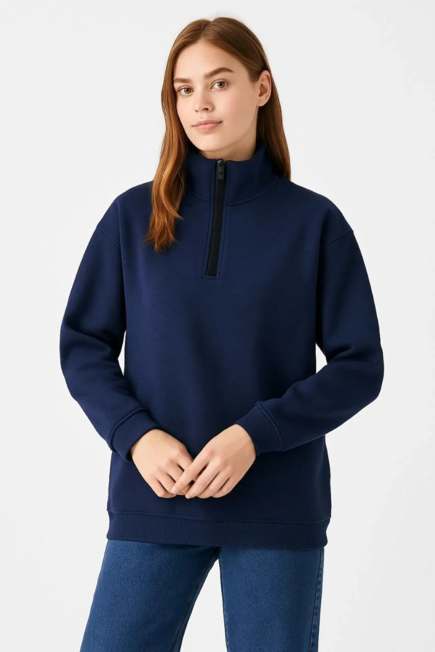 Üç İplik Dık Yaka Yarım Fermuarlı SweatShirt - Lacivert