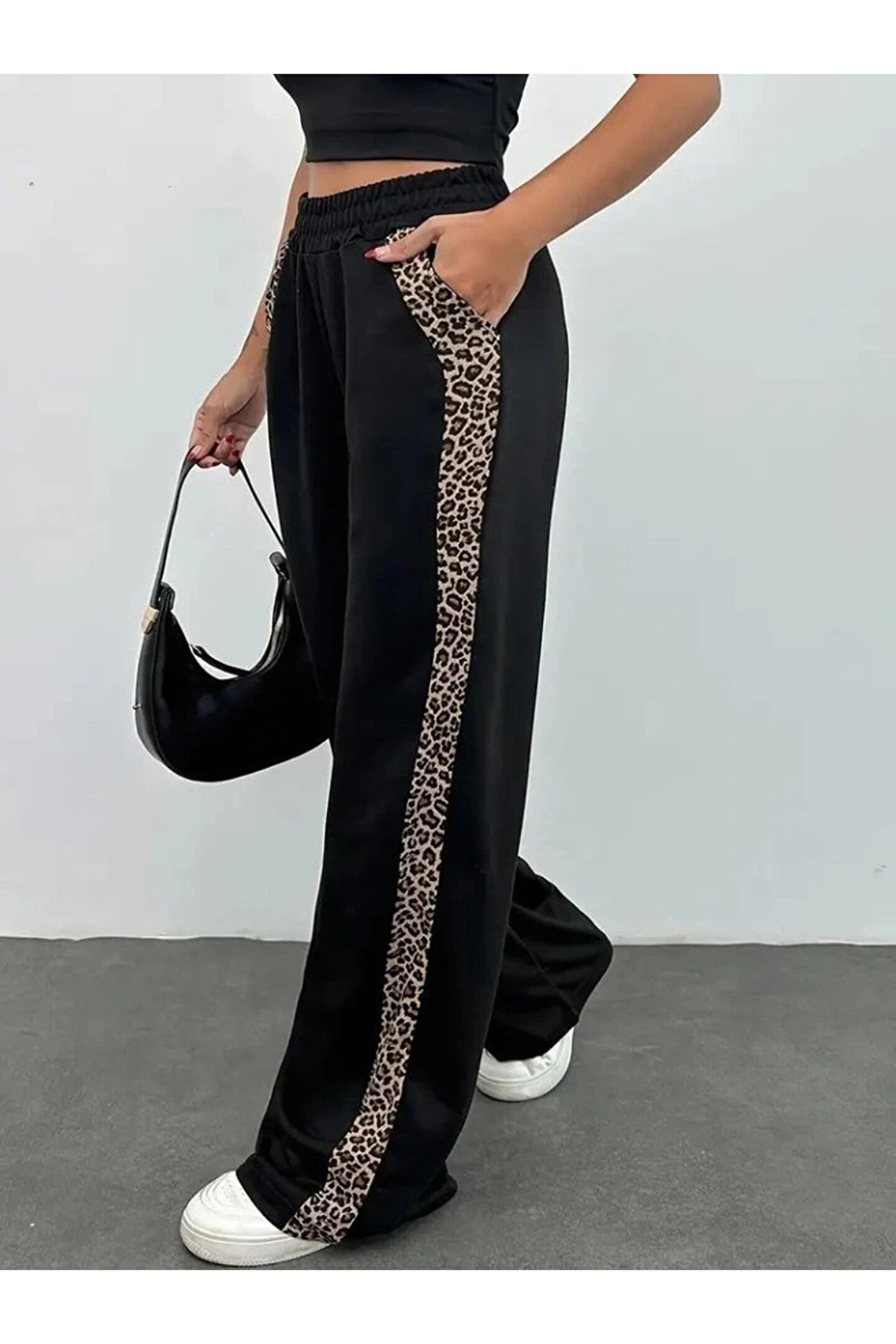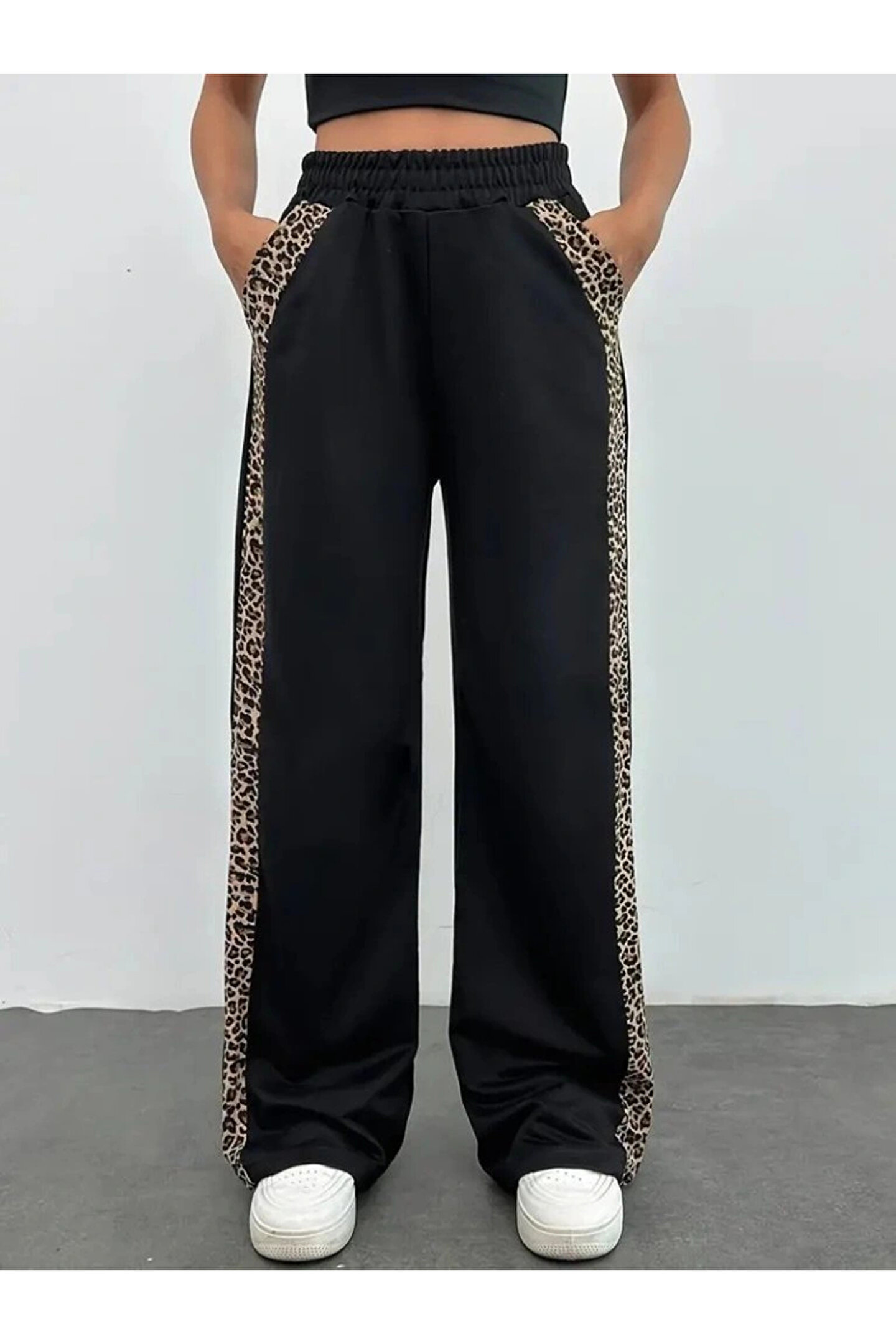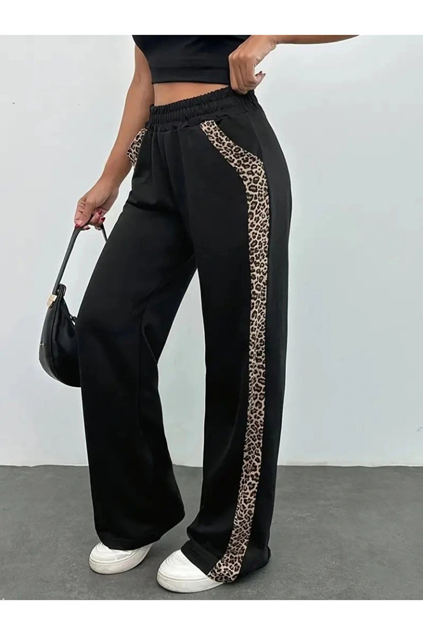 Serero Kadın Yüksek Bel Bağcıklı Yanları Leopar Desenli Viskon Iki Iplik Pantolon