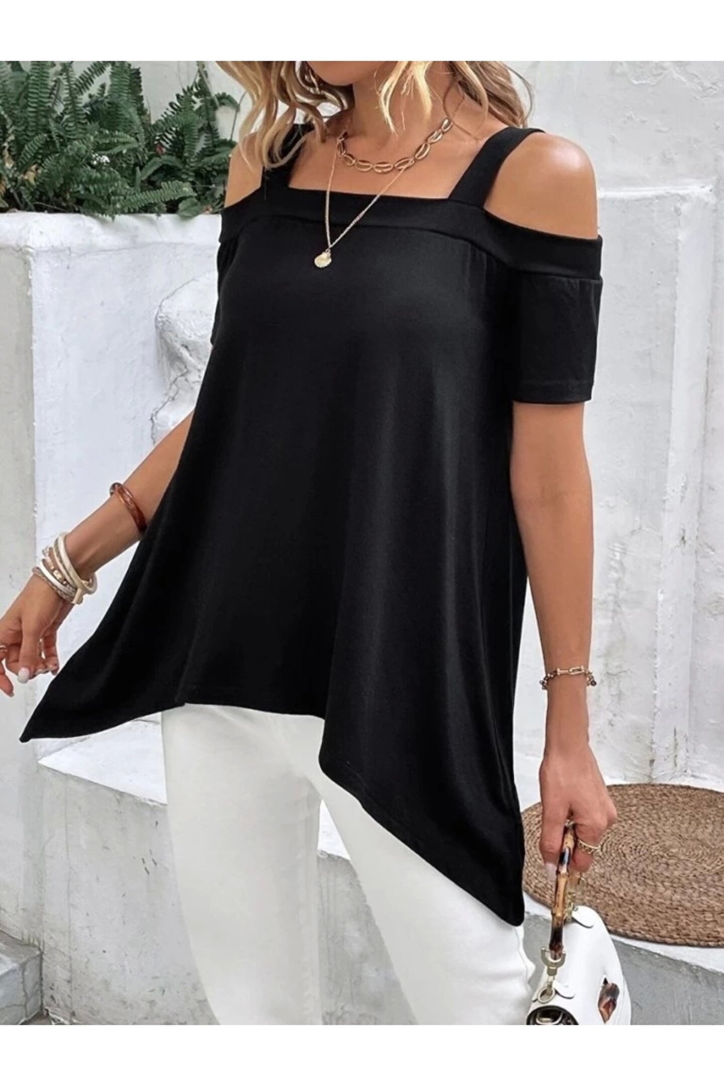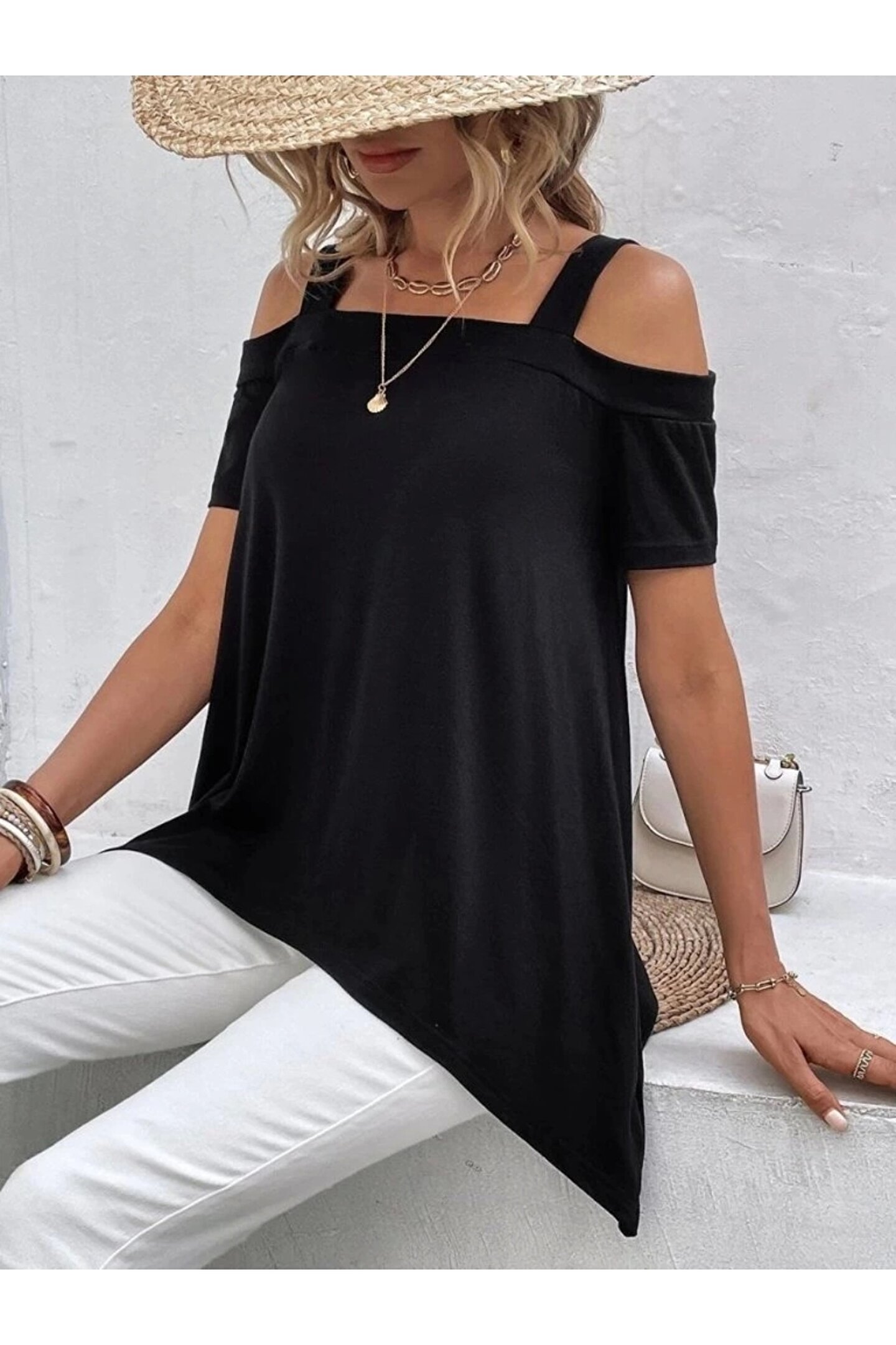 SGM BUTİK Kadın Kısa Kollu Omuzlardan Açık Askılı Asimetrik Kesim Viskon Bluz
