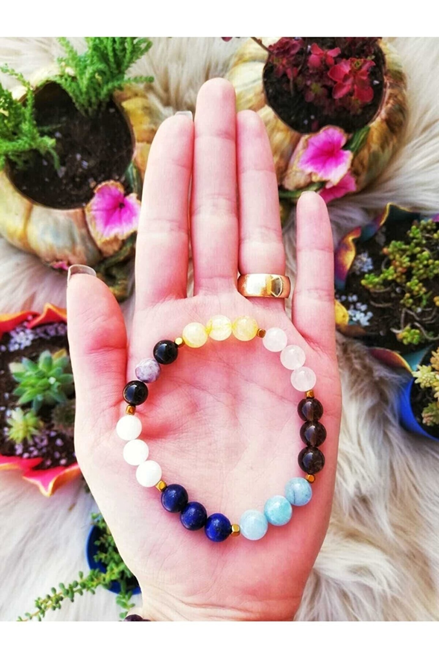 Ürünümüz orijinal doğal taşlardan hazırlanmıştır. ; Unisex modeldir. ; Bileklik aslan burcunun en önemli 7 taşından oluşmaktadır. ; Bunlar lapis lazuli, turmalin, sitrin, akuamarin, pembe kuvars, aytaşı, dumanlı kuvars taşlarıdır.; Taşların boyutu 8mm. ; Ara aparatları nikel kaplamadır. ; Elastik misina kullanılmıştır .; Hediye kutusunda gönderilmektedir. ; Taşlarınızı haftada bir kez akan suda 5dk bekleterek, tütsüleyerek veya bir gece toprak üstünde bekleterek enerjilerini dengeleyip temizleyebilirsiniz. ;
