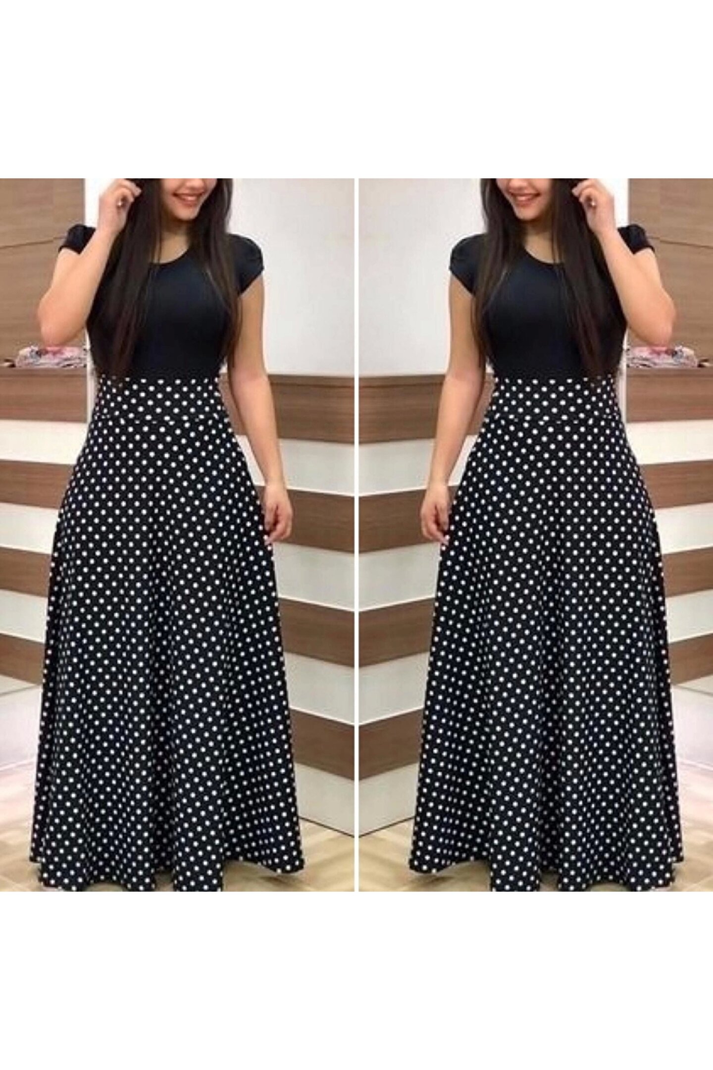 shopivastore Kadın Kısa Kollu Puan Desen Tam Boy Krep Elbise