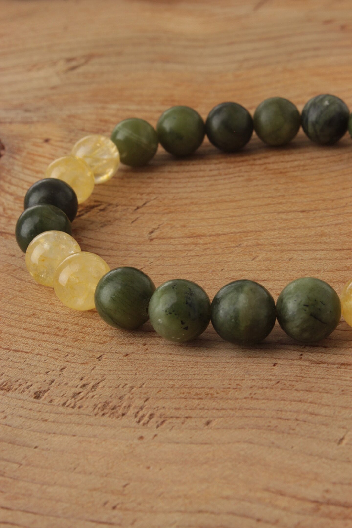 - Doğal taş kullanımı sayesinde her bileklik benzersiz ve otantik bir görünüm sunar; - Yeşim ve sitrin taşlarının uyumlu kombinasyonu, zarif ve göz alıcı bir estetik oluşturur; - 8mm boyutundaki taşlar, bileklikte hem şıklığı hem de rahatlığı bir arada sunar; - Doğal taşların renk ve desen farklılıkları, her bileklikte eşsiz bir parça haline gelir;