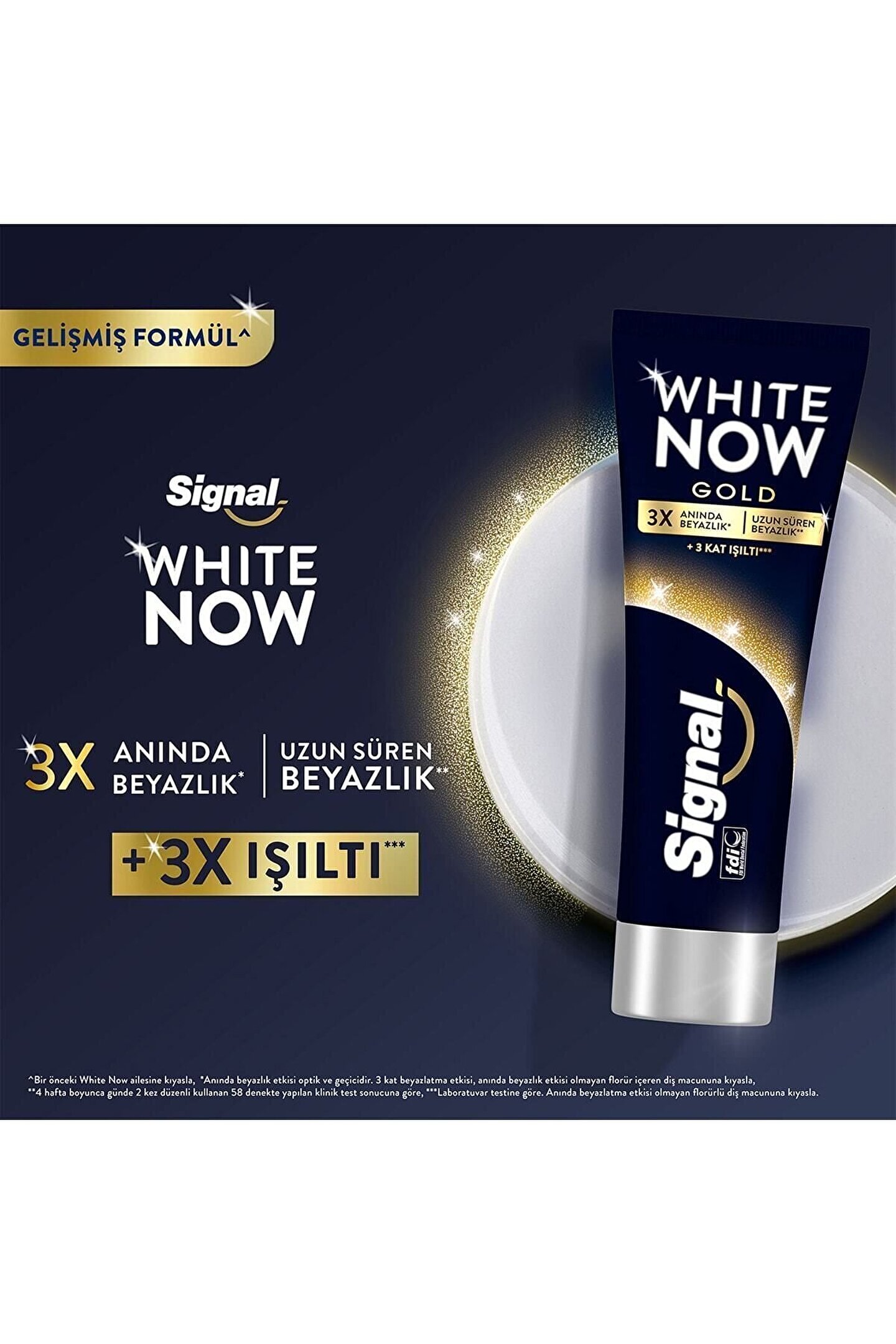 White now etkisi siz de anında bembeyaz bir gülüşün hayalini kuranlardan mısınız? Doğru diş bakımı alışkanlıkları ve kaliteli ürün kullanımıyla ışıldayan, bembeyaz dişlere kavuşmak mümkündür. ; White now'ın kusursuz uzman beyazlatıcı diş macunları ve diş fırçalarını mutlaka keşfedin. ; Signal white now serisi formüllerinde yer alan özel bileşenler sayesinde ilk kullanımdan itibaren dişlerde beyazlık etkisi yaratır. ; White now diş macunu çeşitlerini dört hafta düzenli kullandığınızda beyazlatıcı etkisi olmayan diş macunlarına göre 3 kat beyazlık elde edersiniz. ; Dünya diş hekimlerinden onay almış olan white now serisi beyazlatma formülünün yanında florür de içerdiğinden günlük kullanıma da uygundur. ; Signal white now gold diş macunu renk kusurlarını düzelten mavi safir pigment teknolojisi! Signal white now gold diş macunu, ilk fırçalamadan itibaren dişlerinize anında 3 kat beyazlık sağlar ve anında beyazlık etkisi klinik olarak da kanıtlanmıştır.* diş lekelerini gidermeye yardımcı beyazlık sağlayan formülü sayesinde düzenli kullanımda daha beyaz dişlere sahip olmanızı sağlar. ; Beyazlatıcı diş macunu, renk kusurlarını düzelten mavi-Safir pigment teknolojisi ile dişlerinizi aşındırmadan hayalini kurduğunuz beyaz dişlere sizi kavuşturur. ; Çay, kahve, nikotin gibi lekelerden dişlerinizi arındırır. ; Günlük kullanım için uygundur. ; Beyazlık etkisi dişlerinizin başlangıçtaki doğal rengine göre değişiklik gösterebilir. ; Signal white now gold diş macunu kumaşta leke bırakabilir. ; Unutmayın, anında bembeyaz bir gülüş için beyaz dişlerden fazlası gerekir. ; Doğru ağız sağlığı hepsinden önemlidir. ; Harika beyaz bir gülüş için signal diş fırçaları ile deneyin, farklı diş bakımı deneyimleri için signal’in diğer diş macunları ile de tanışın! Dişlerinizin üzerindeki lekelerden kaçınmak için içtiklerinize dikkat edin. ; Dişlerinizi beyazlatmak ve korumak için doğru bir diş macunu seçin. ; Ulaşması zor yerler için ağız yıkama suyu ve diş ipi kullanın. ; Sigara içmek ve tütün çiğnemek gibi alışkanlıklarla vedalaşın. ; Çok fazla şeker içeren gıdalardan uzak durun. ; Uygun diş fırçası kullanın ve fırçanızı 3 ayda 1 değiştirin. ; Net miktar (g/ml) 75menşei fransaürün bilgilerini kullanma hakkında internet sitemizde ve online satış kanallarımızda yer alan ürün etiket bilgileri, ürünün tedarikçisi tarafından migros ticaret a.Ş.’ye iletilen en güncel bilgilerdir. ; Ürün etiket bilgileri ile internet sitemiz ve online satış kanallarımızda bulunan bilgiler arasında herhangi bir farklılık bulunması halinde sorumluluk tamamen tedarikçi firmaya aittir.;