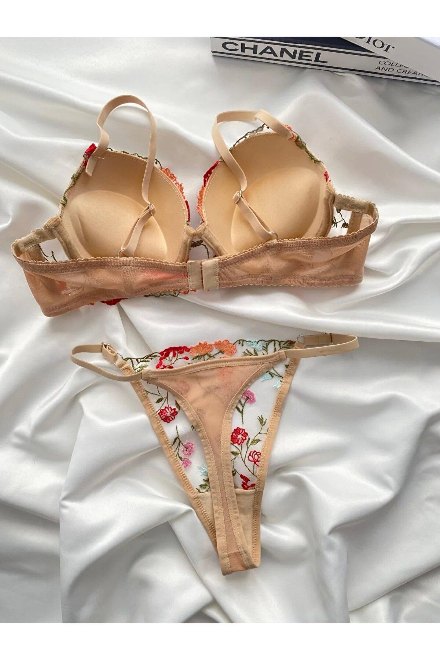 Ürün Detayları Destekli-Balenli-Kaplı-Telli Adelina Brode Takım Zarafetinizi ortaya çıkarın ve Adelina koleksiyonu ile doğanın güzelliğini üzerinizde taşıyın.; İnce detaylarla işlenmiş bu özel tasarım, zarif çiçek motifleri ile lüks işçiliği bir araya getiriyor.; Hafif tül panelleri ve yumuşak nude tonları, teninize dokunan neredeyse hissedilmeyen bir rahatlık sunarken, vücudunuzu renk ve dokuların senfonisiyle kucaklıyor.; Adelina doğal hatlarınızı vurgulayarak hem feminen hem de zamansız bir görünüm yaratıyor.; Rahatlık kadar şıklık da göz önünde bulundurularak tasarlanan bu koleksiyonda, ayarlanabilir askılar ve özenle hazırlanmış kesim mükemmel bir uyum sağlıyor.; Takımla uyumlu tanga ise romantik ve kusursuz bir silueti tamamlıyor.