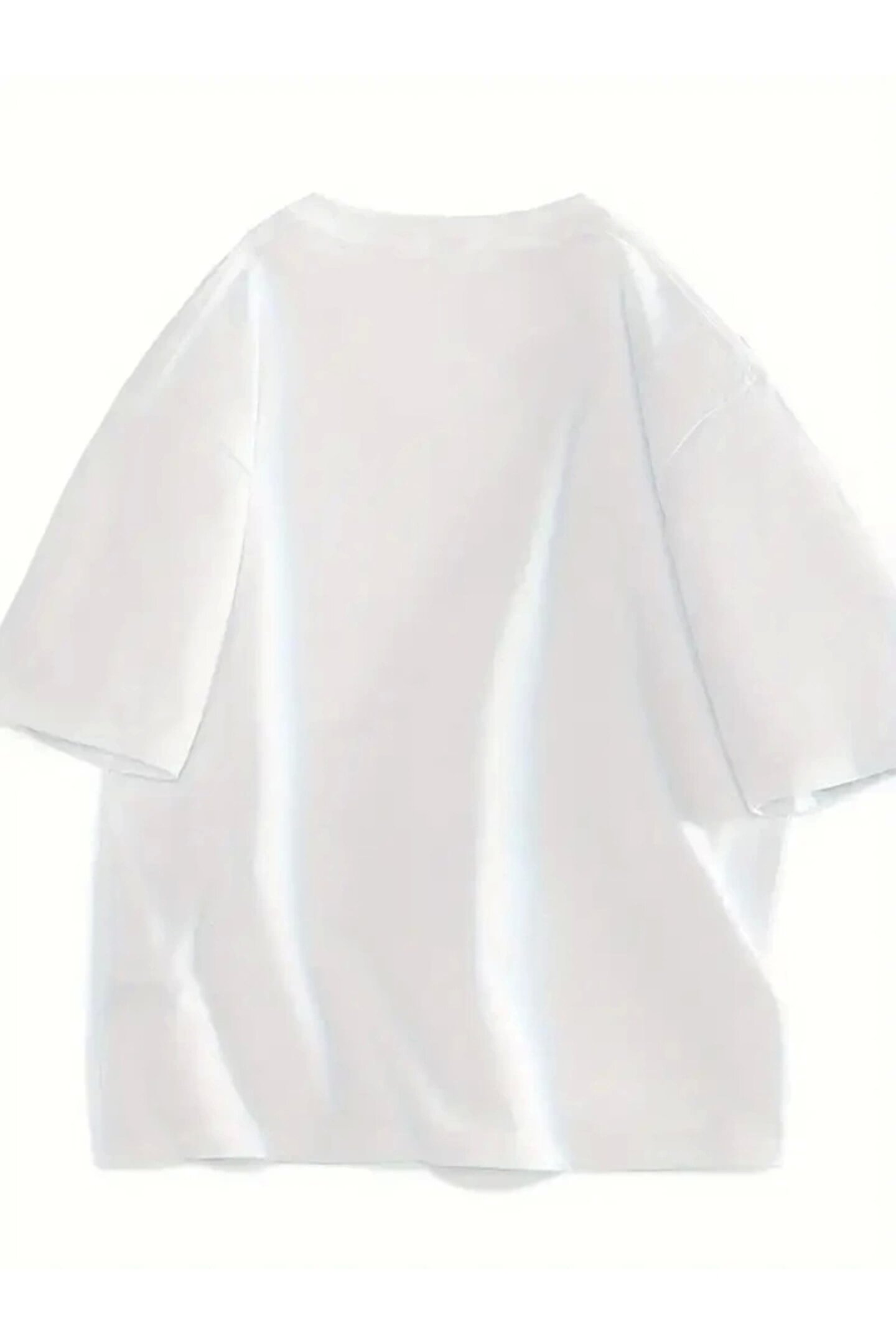 Baskılı Oversize Bisiklet Yaka T-shirt - Beyaz