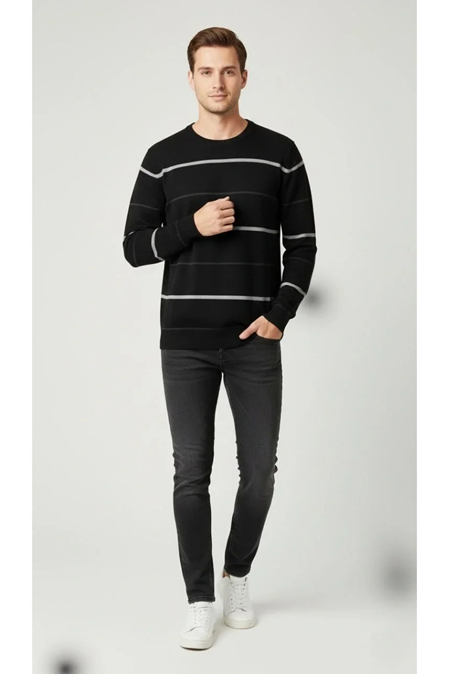 Silerra Erkek Bisiklet Yaka Cizgili Triko Kazak yumuşak dokulu Pamuklu ince Dokuma, uzun kollu Rahat Regular