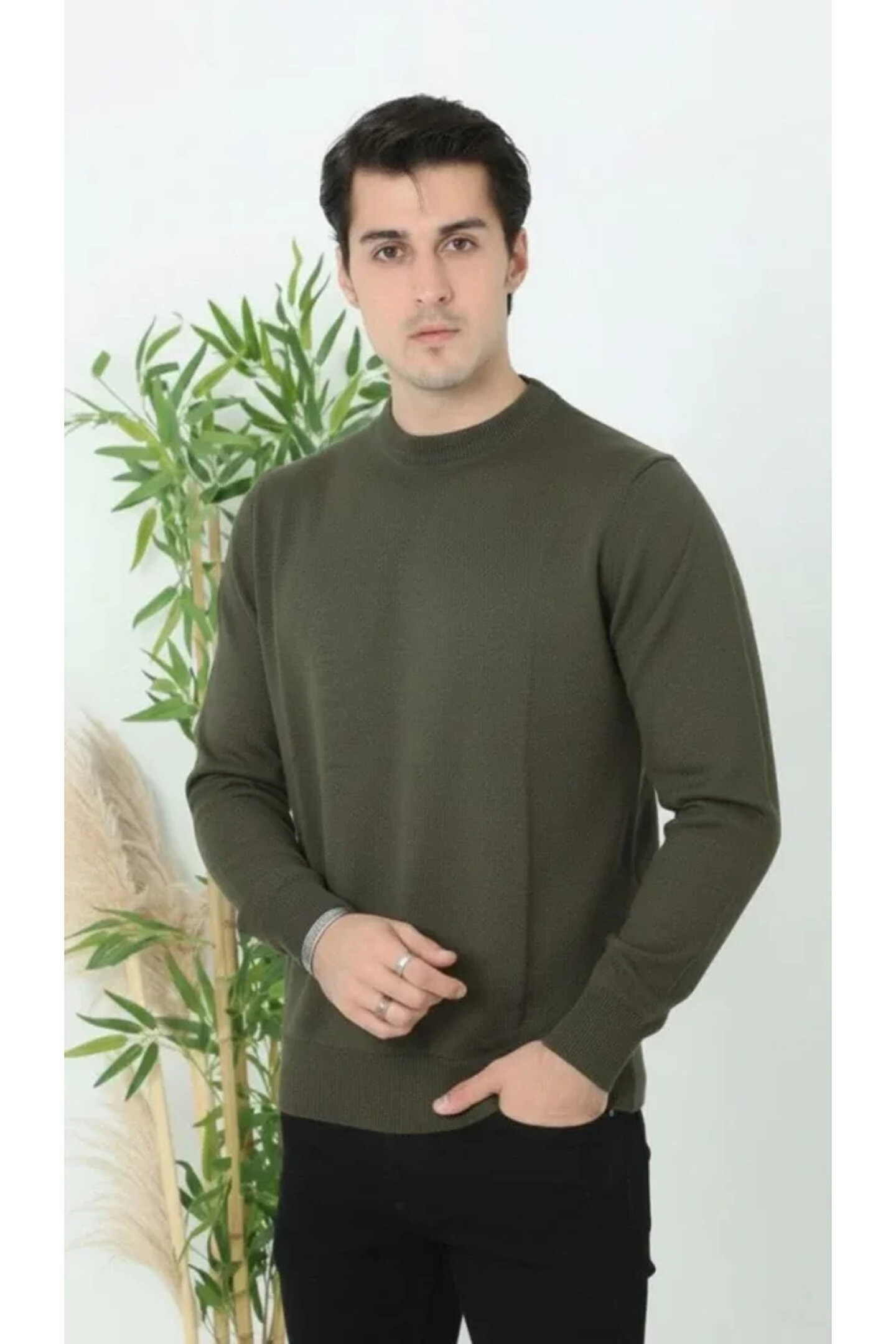 Erkek Bisiklet Yaka Triko Kazak Yumuşak Dokulu Pamuklu Ince Dokuma, Uzun Kollu Rahat Regular Kalıp - Haki