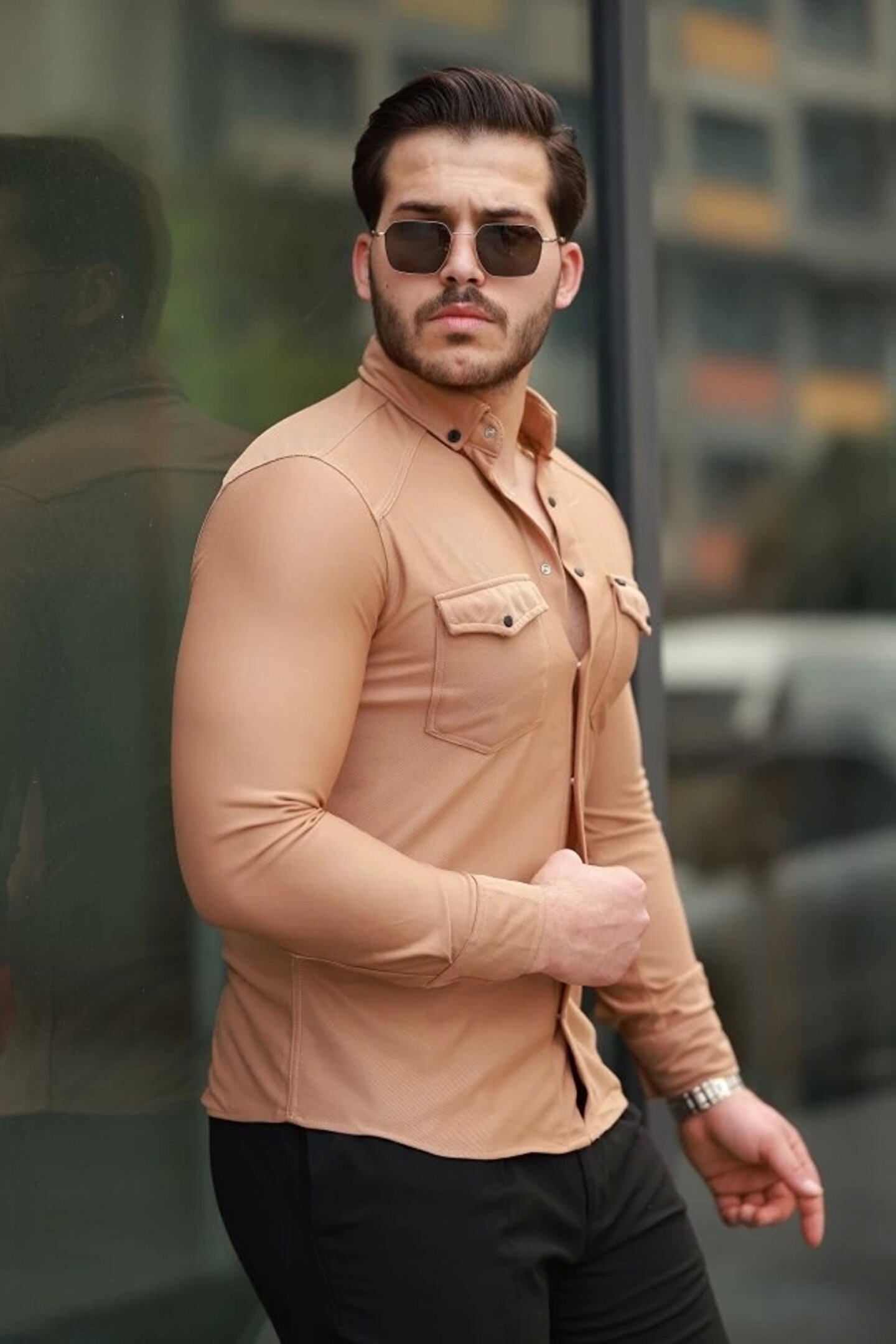 Silerra Erkek çift Cepli çıtçıt Düğmeli Uzun Kollu Gömlek