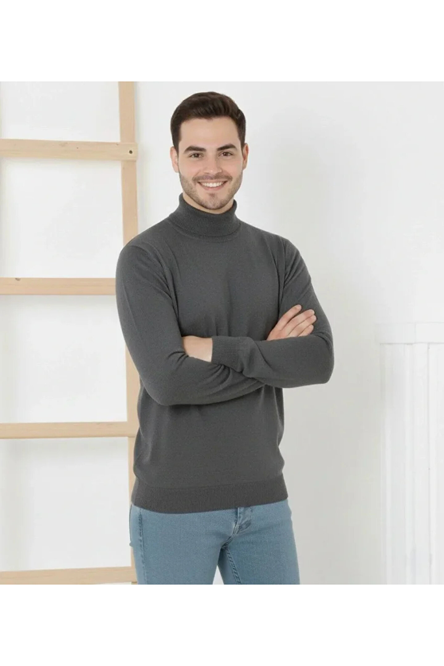 Erkek Yarım Boğaz Triko Kazak Yumuşak Dokulu Pamuklu Ince Dokuma, Uzun Kollu Rahat Regular Kalıp - Füme