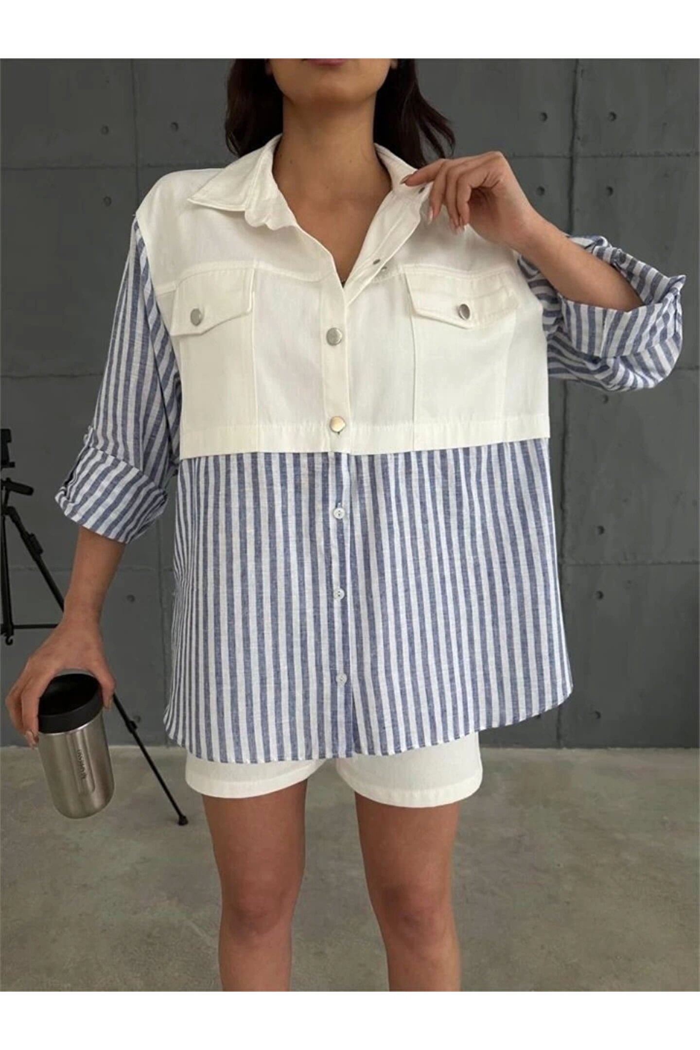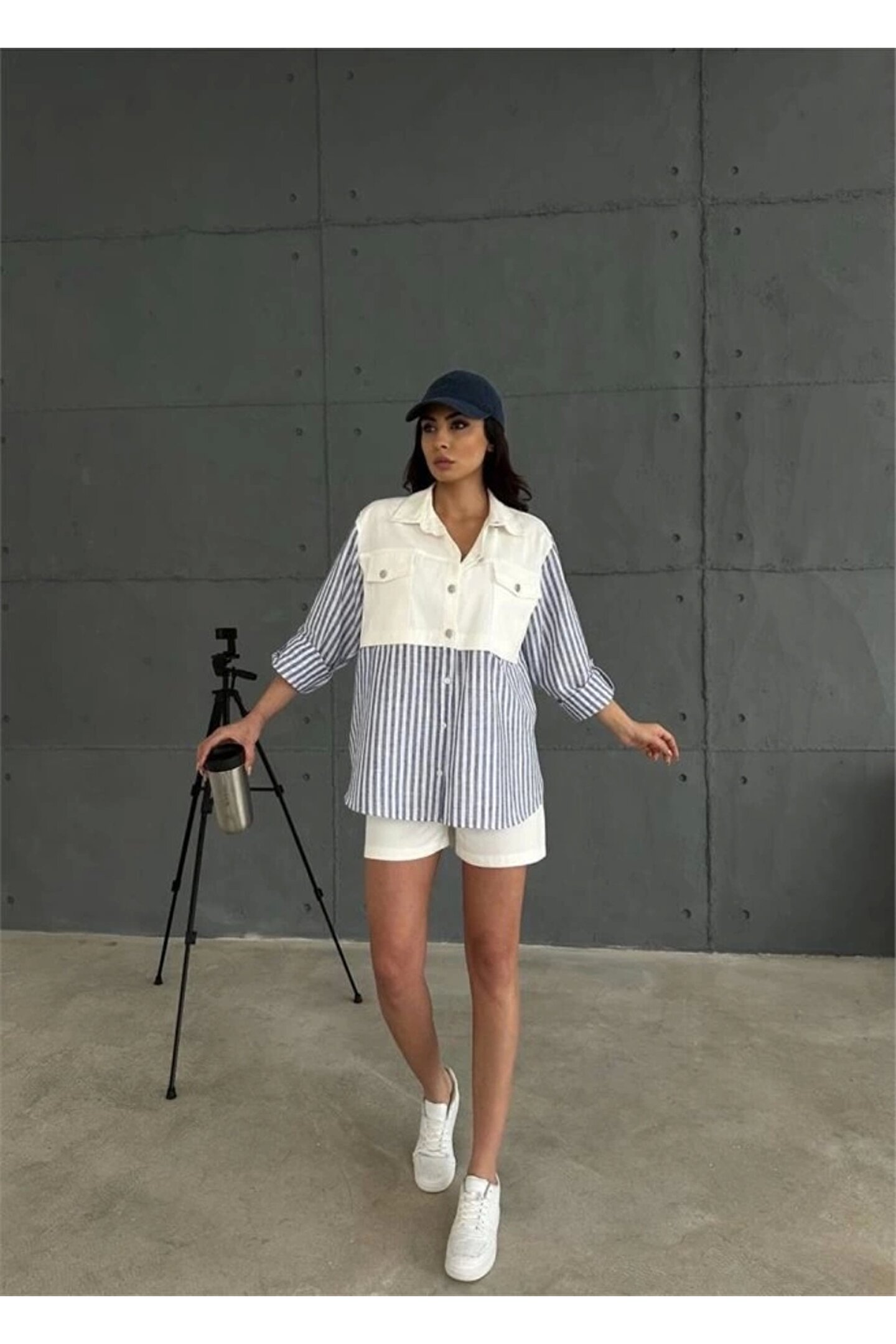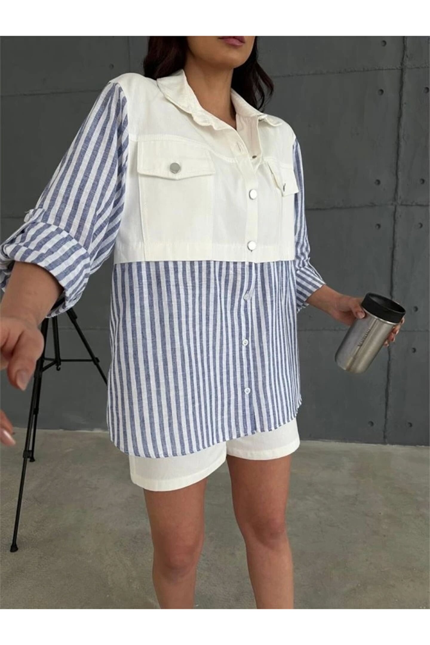 Silerra GABARDİN ŞORT GABARDİN ÇİZGİİ KETEN GARNİİ CEKET TAKI acivert