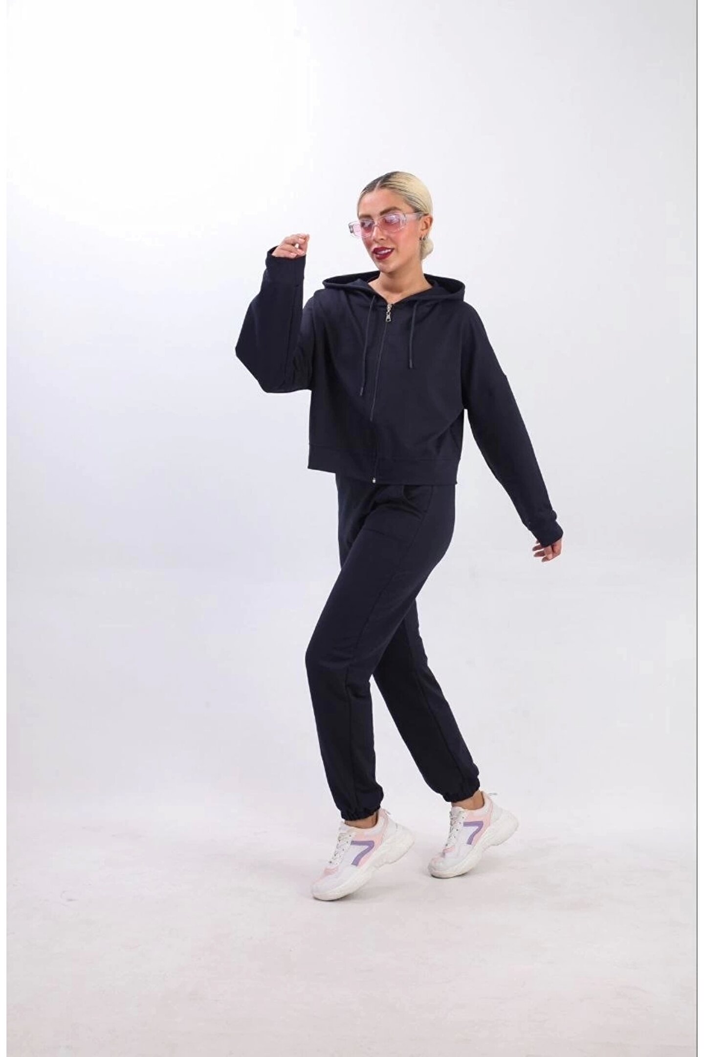 Iki Iplik Kapüşonlu Fermuarlı Crop Oversize Hırka Takım- Lacivert