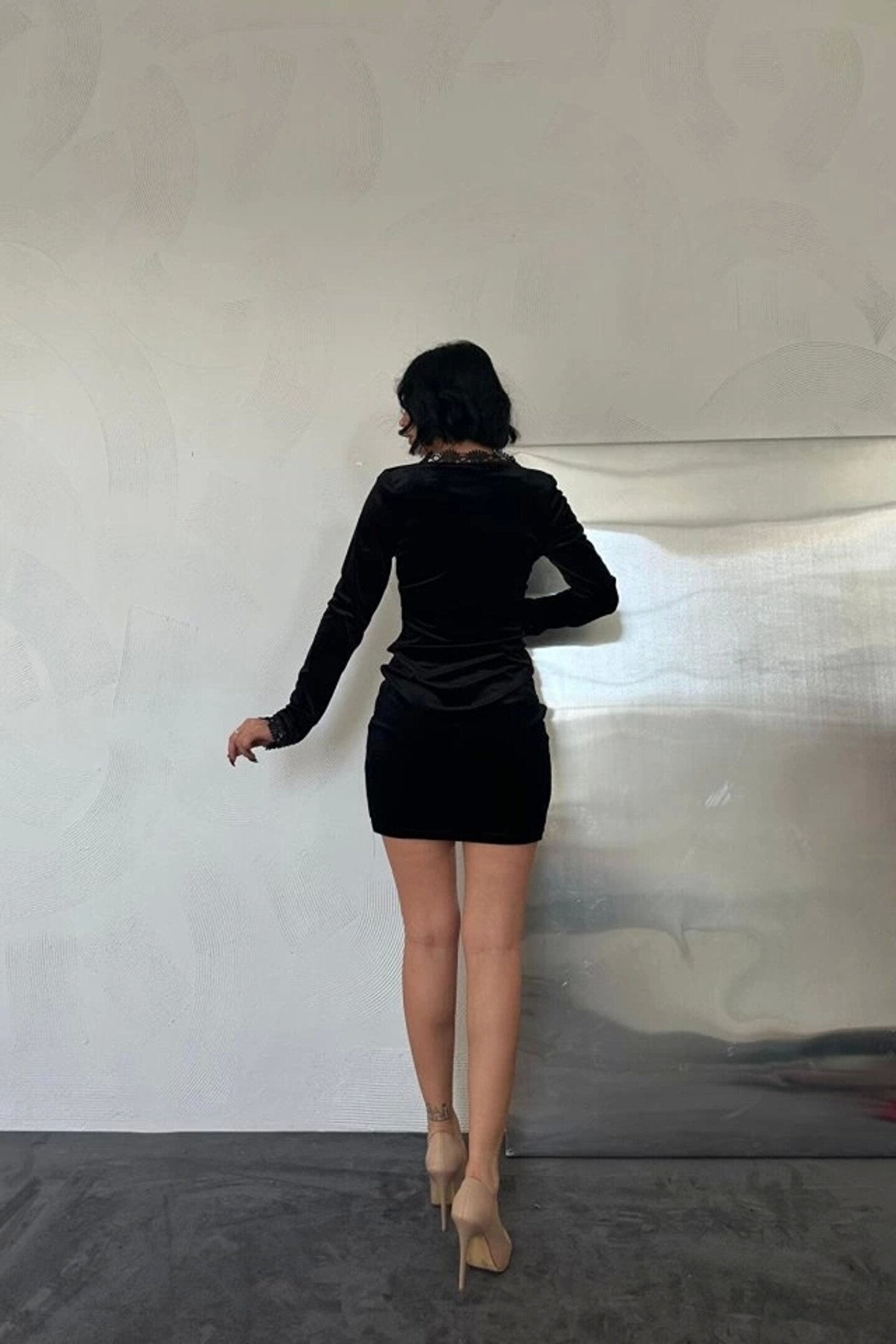 Siyah Yaka Ve Kol Dantelli Mini Elbise