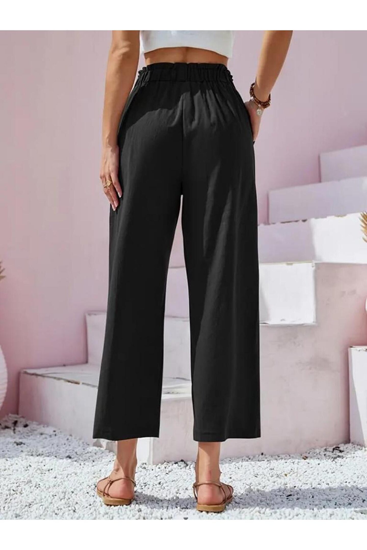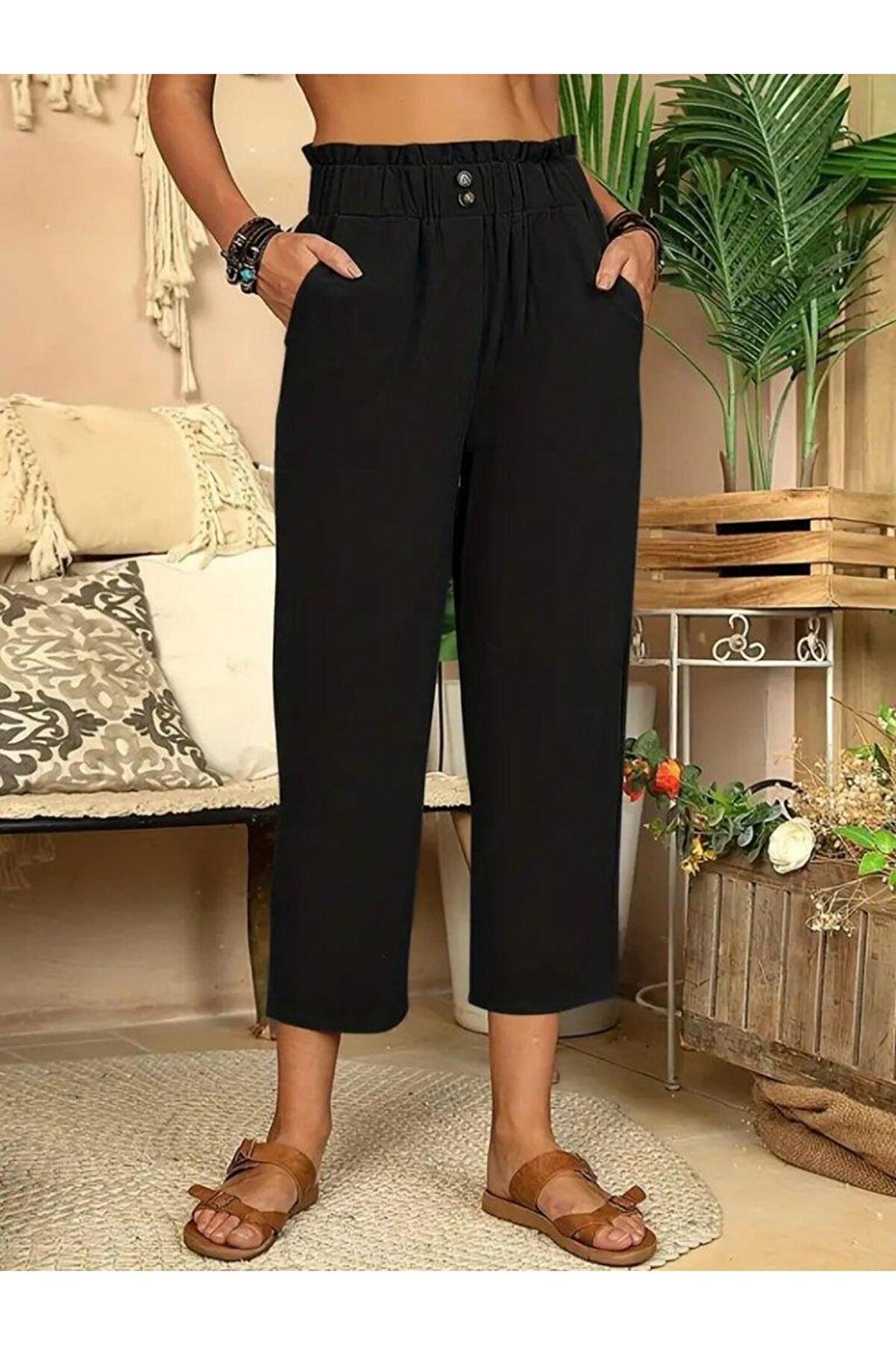 Kadın Bel Büzgü Ve Düğme Detay Kapri Keten Pantolon