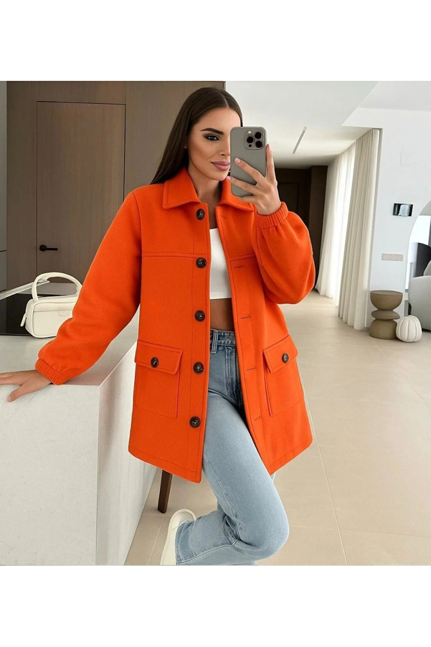 Kadın Bileği Lastikli Cep Ve Leopar Düğme Detay Kaşe Kaban