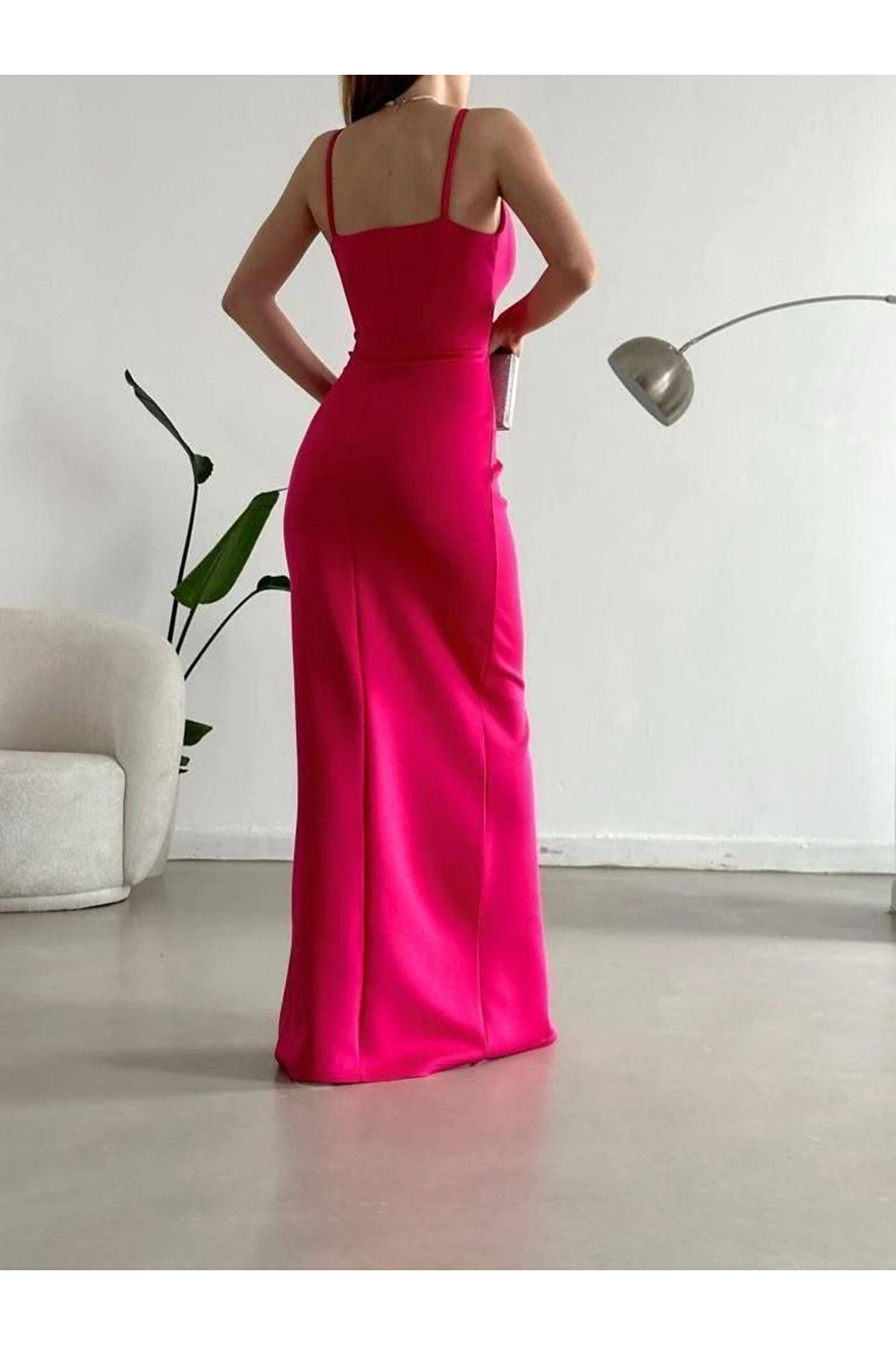 Ürün Adı: Kadın Dalgıç Kumaş Askılı Yırtmaç Detaylı V Yaka Maxi Boy Elbise;