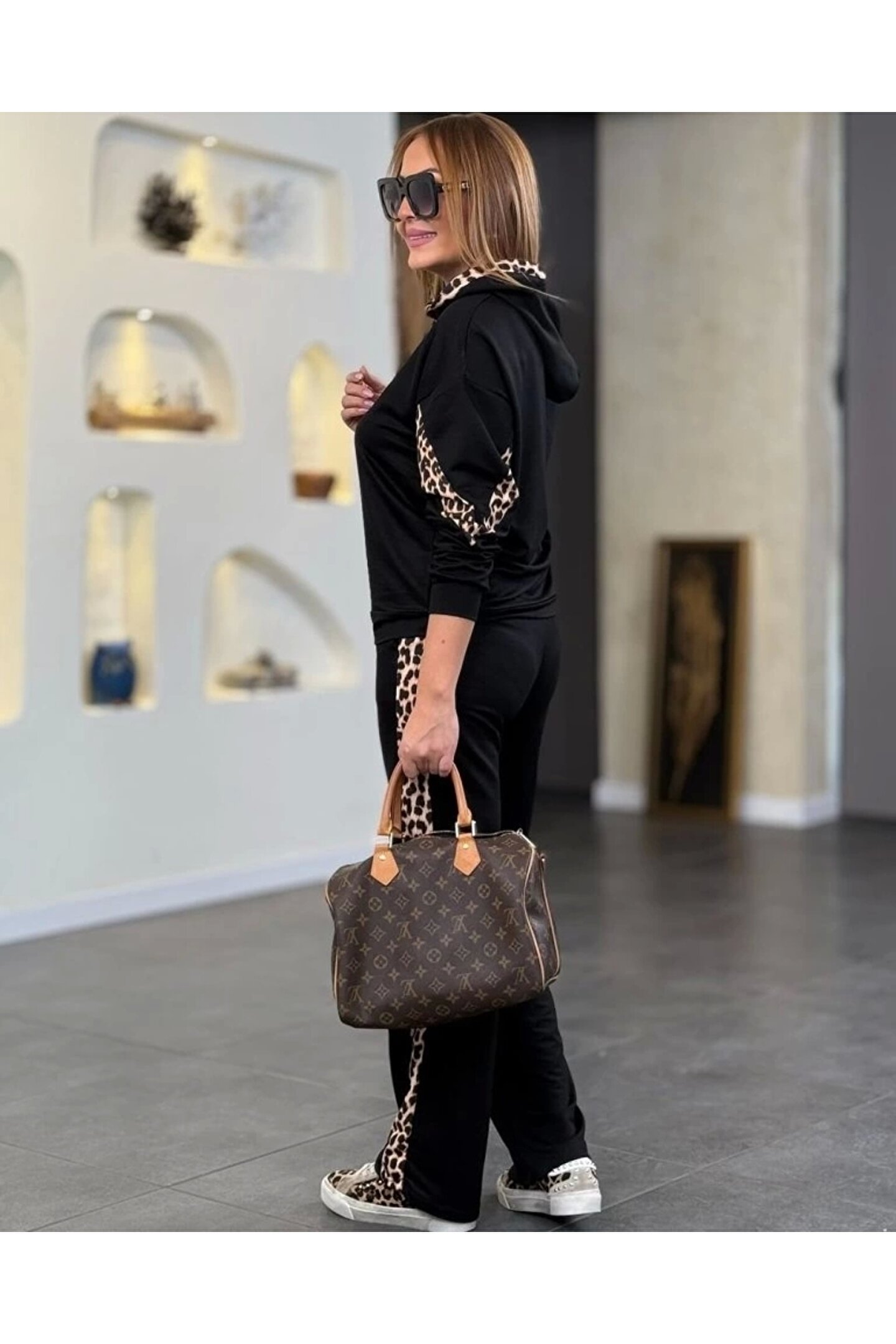 Kadın Kapüşonlu Leopar Detay Sweat Ve Yüksek Bel Yanları Leopar şeritli Bol Paça Pantolon Ikili Takım