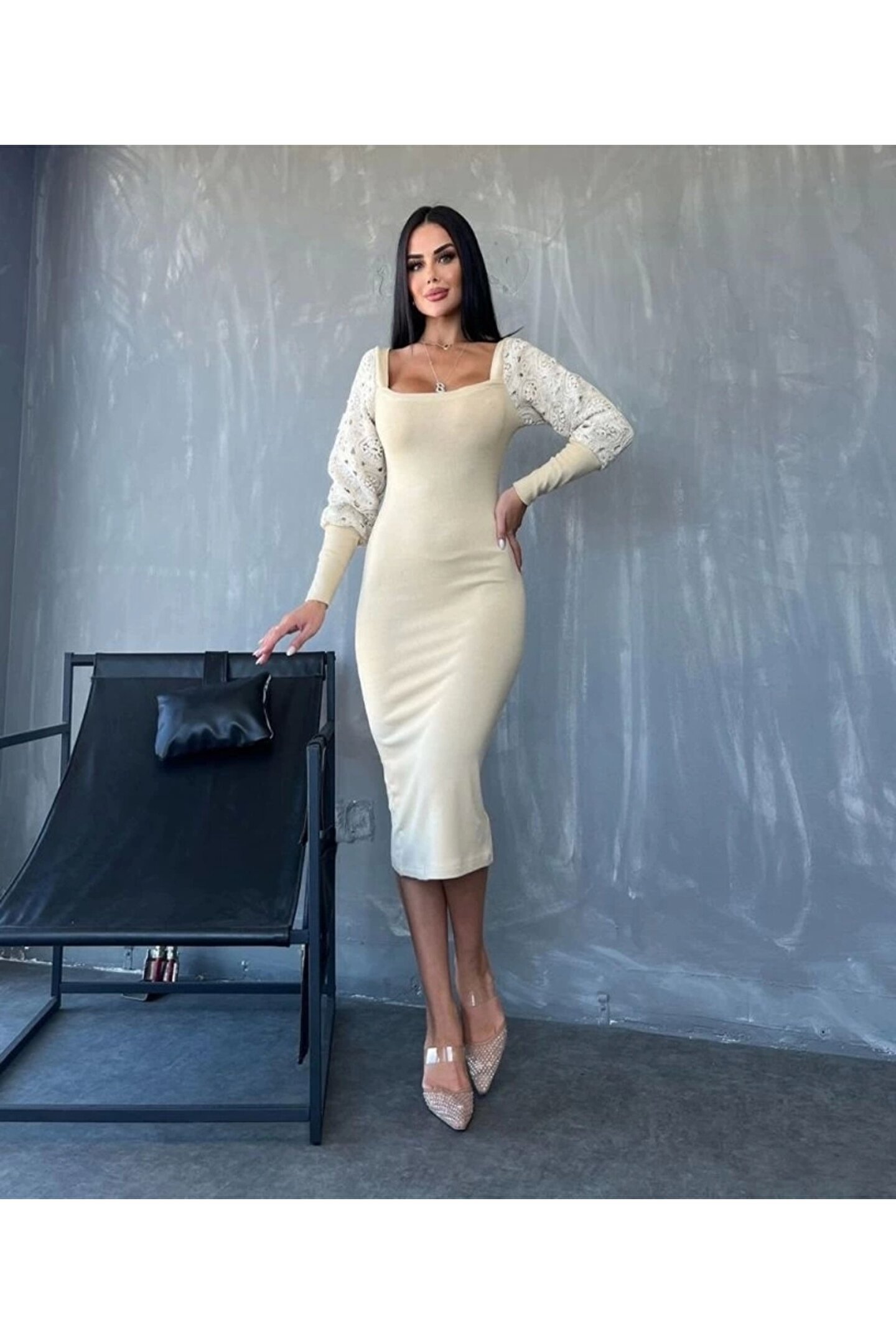Kadın Kare Yaka Kolları Manşet Ve Tül Detay Fırsat ürün Midi Boy Elbise