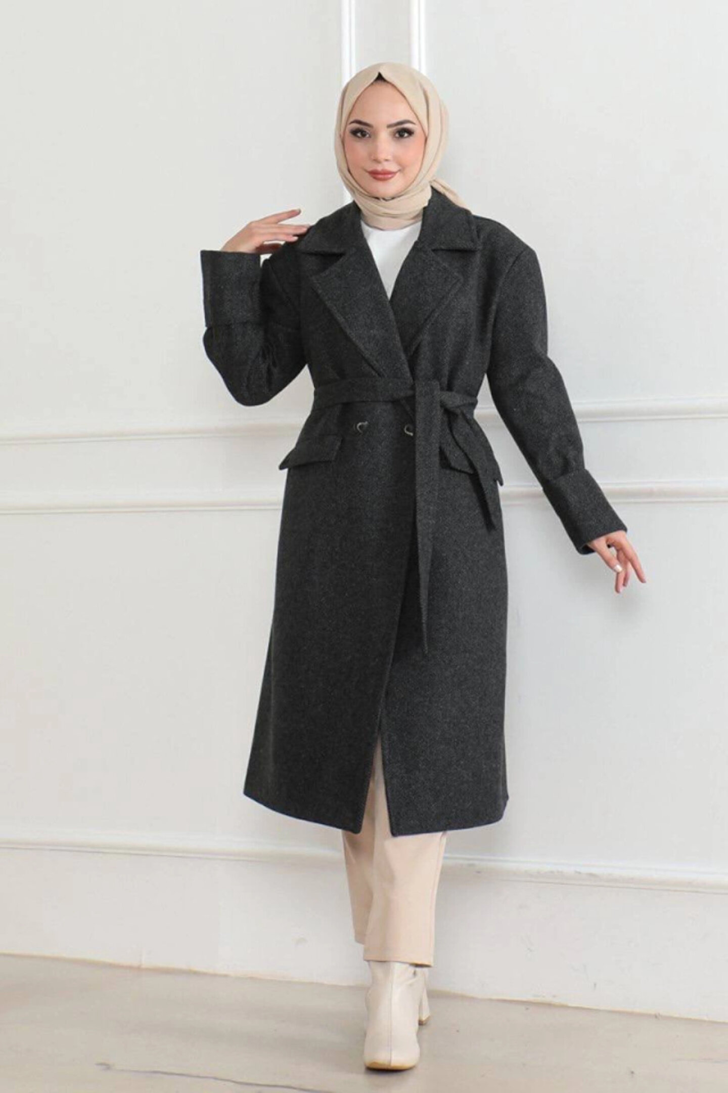 Silerra Kadın Kaşe Kaban – Uzun Boy 115 cm Kruvaze Yaka Kuşaklı Astarlı Kışlık Tesettür Kaban, Yünlü Dokuma