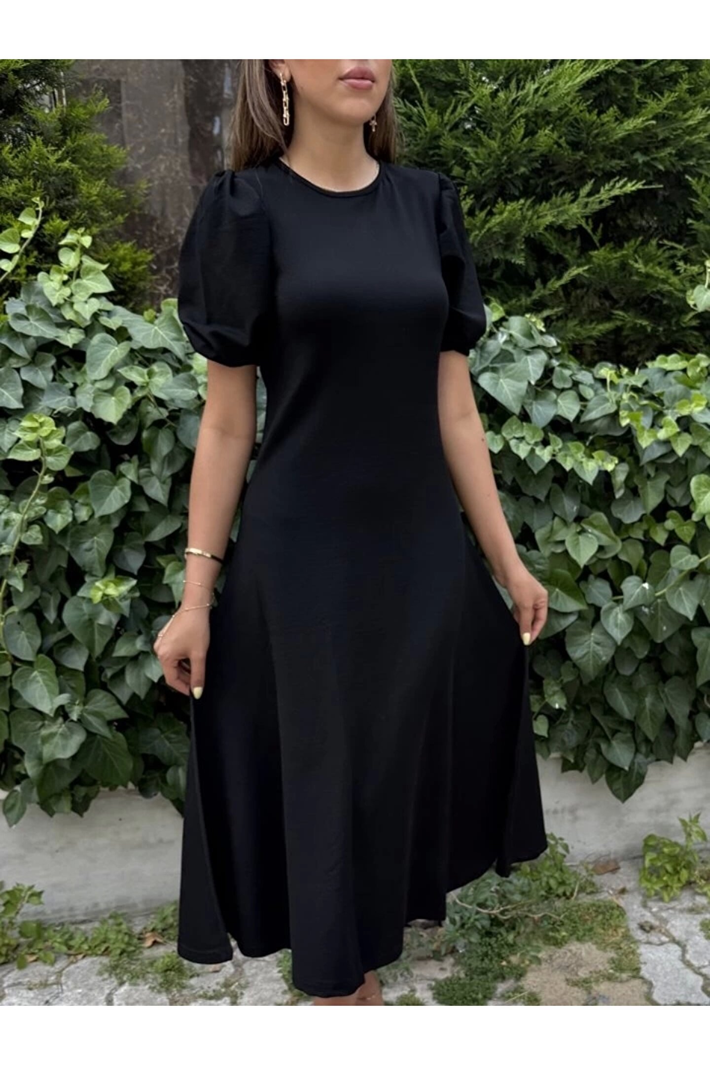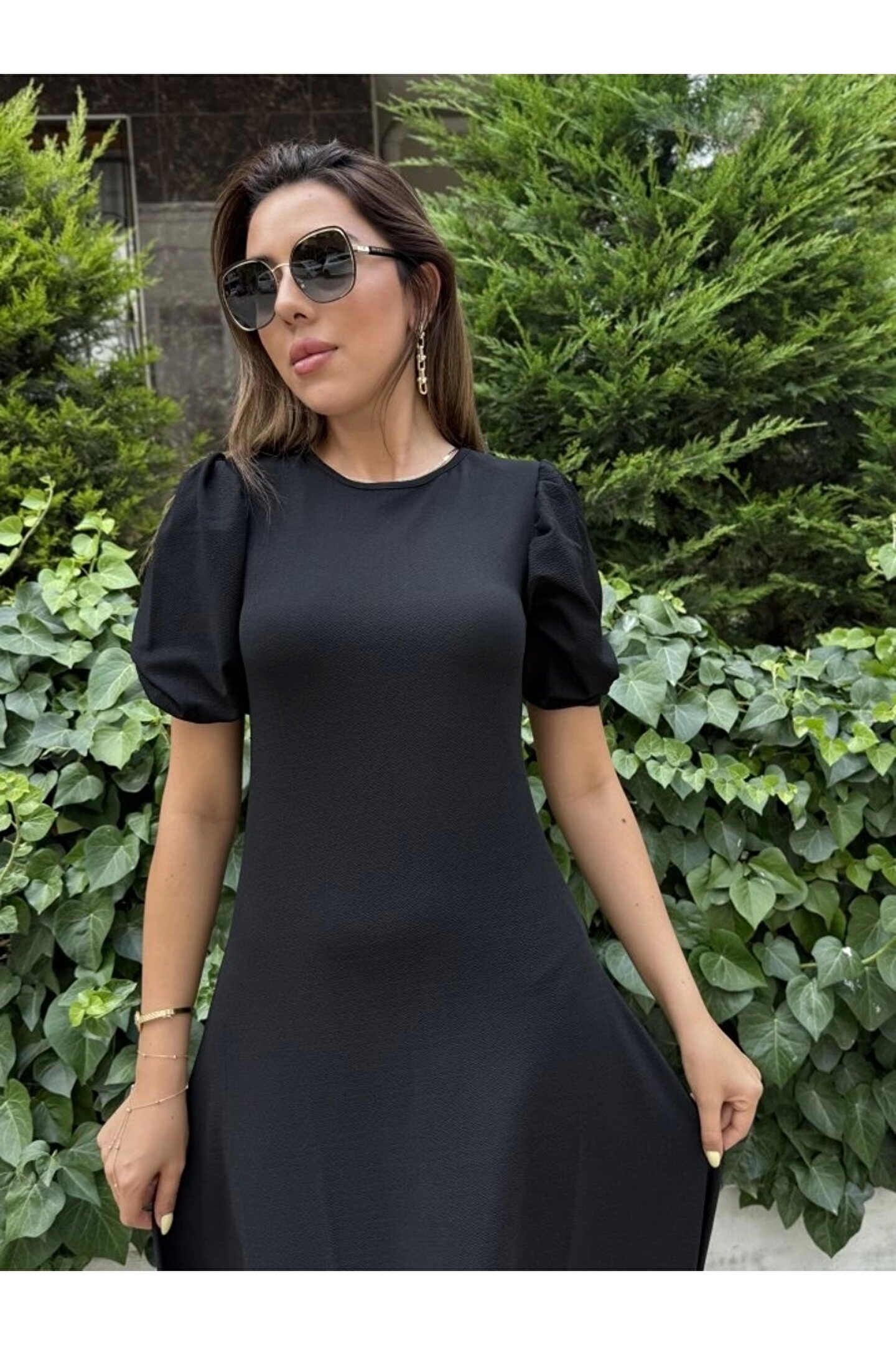 Kadın Kısa Balon Kollu Bisiklet Yaka Geniş Kesim Janjan Krep Elbise