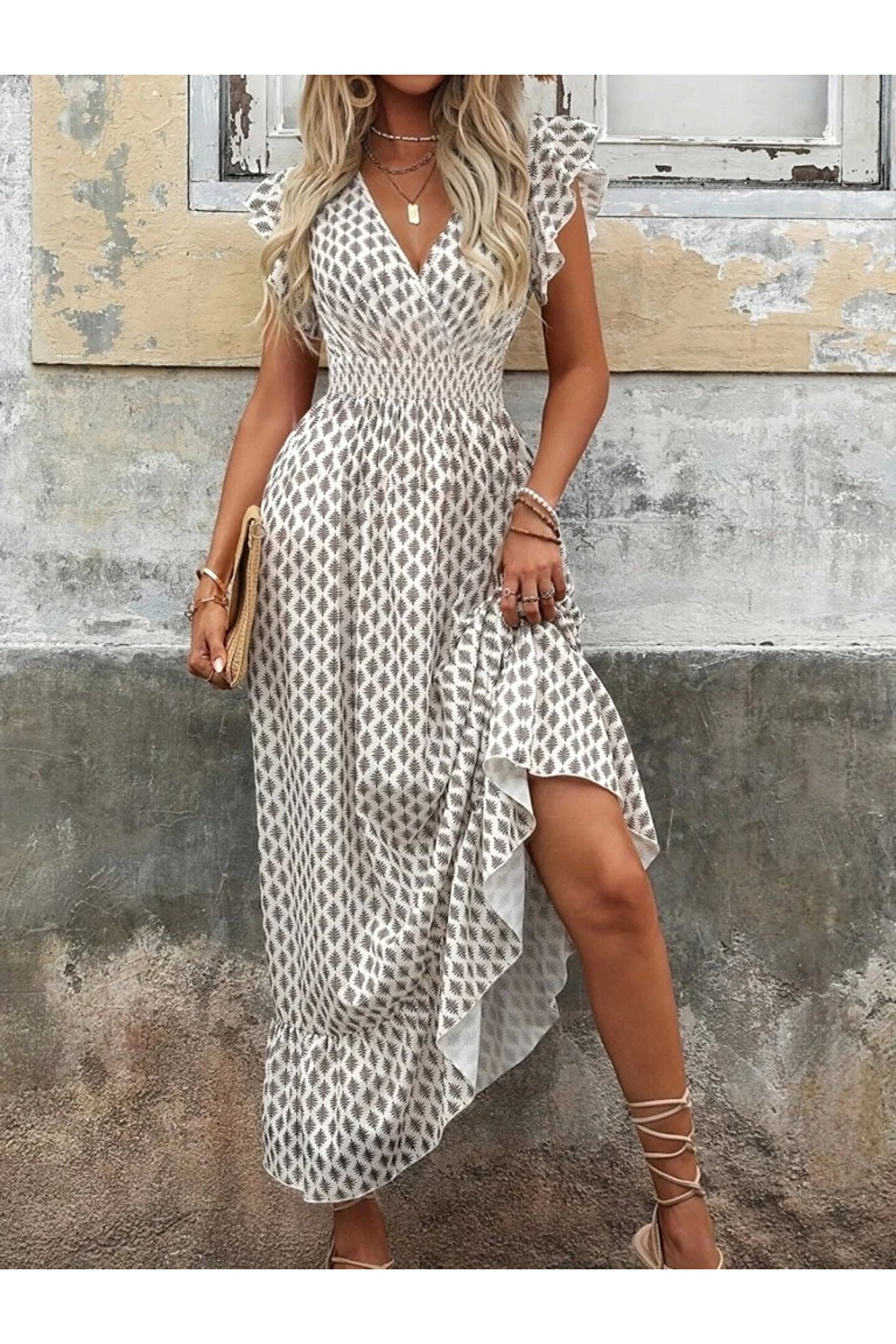Kadın Kısa Kelebek Kollu Kruvaze Yakalı Desenli Süprem Elbise