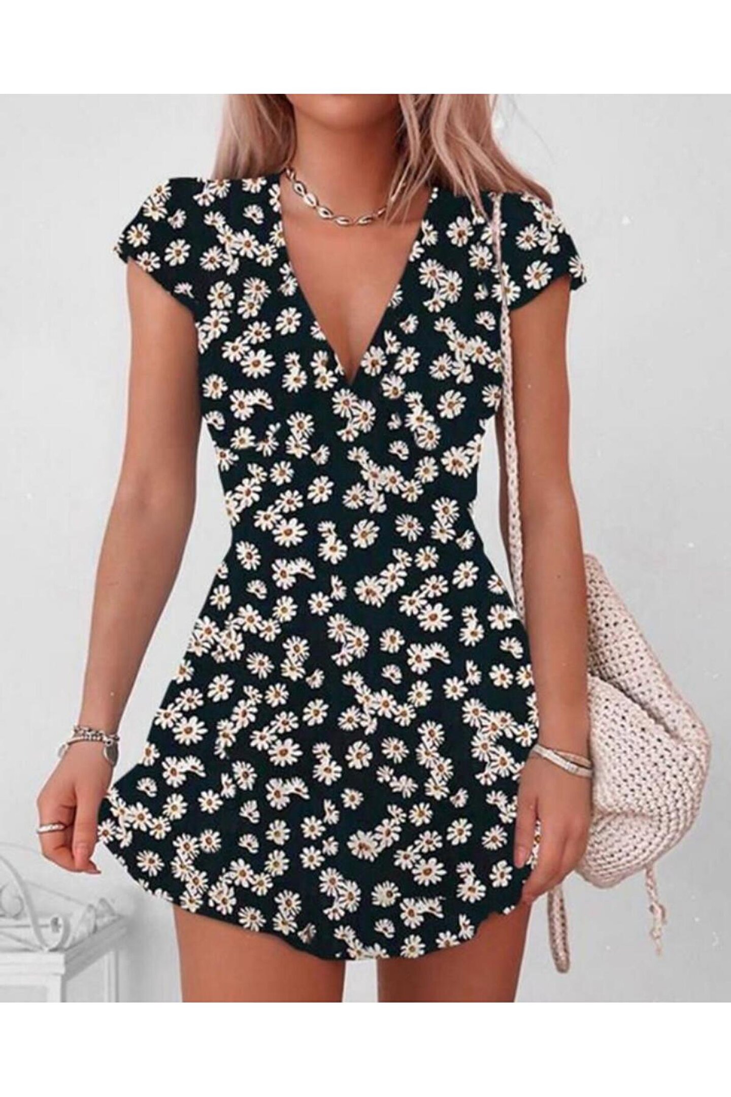 Kadın Kısa Kollu Kruvaze Yaka Papatya Baskılı Krep Elbise