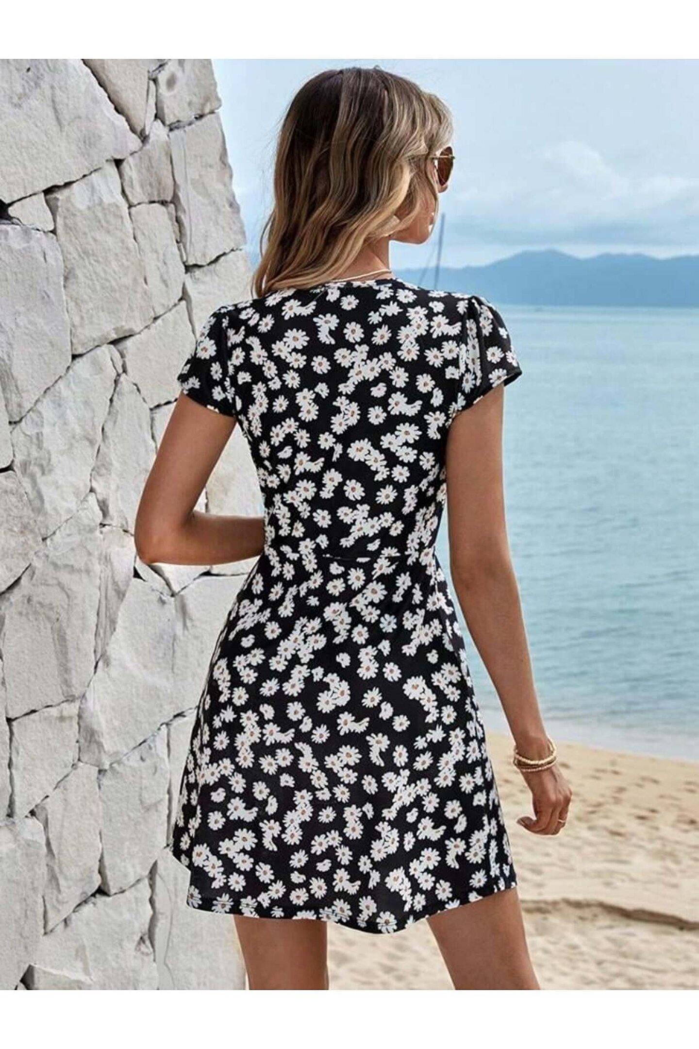Silerra Kadın Kısa Kollu Kruvaze Yaka Papatya Baskılı Krep Elbise