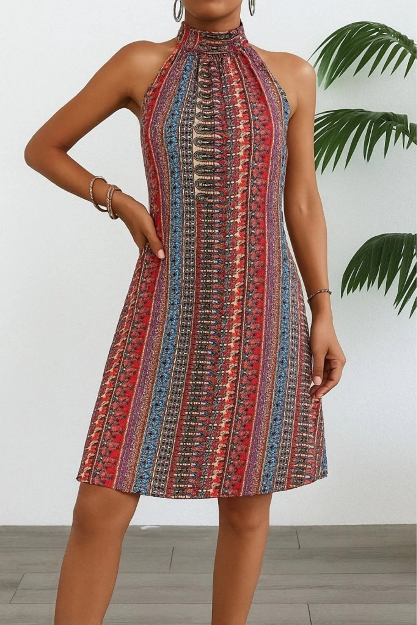 Kadın Kolsuz Boyundan Askılı Desenli Midi Süprem Elbise