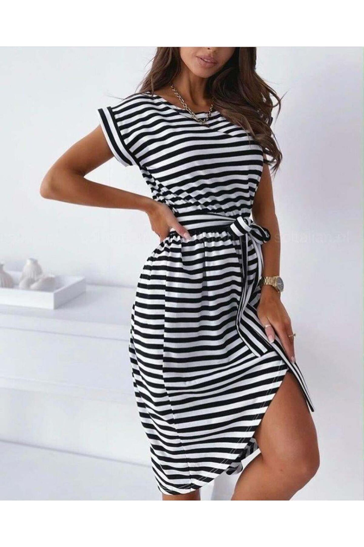 Kadın Kuşaklı Turlu Viskon Kumaş Elbise
