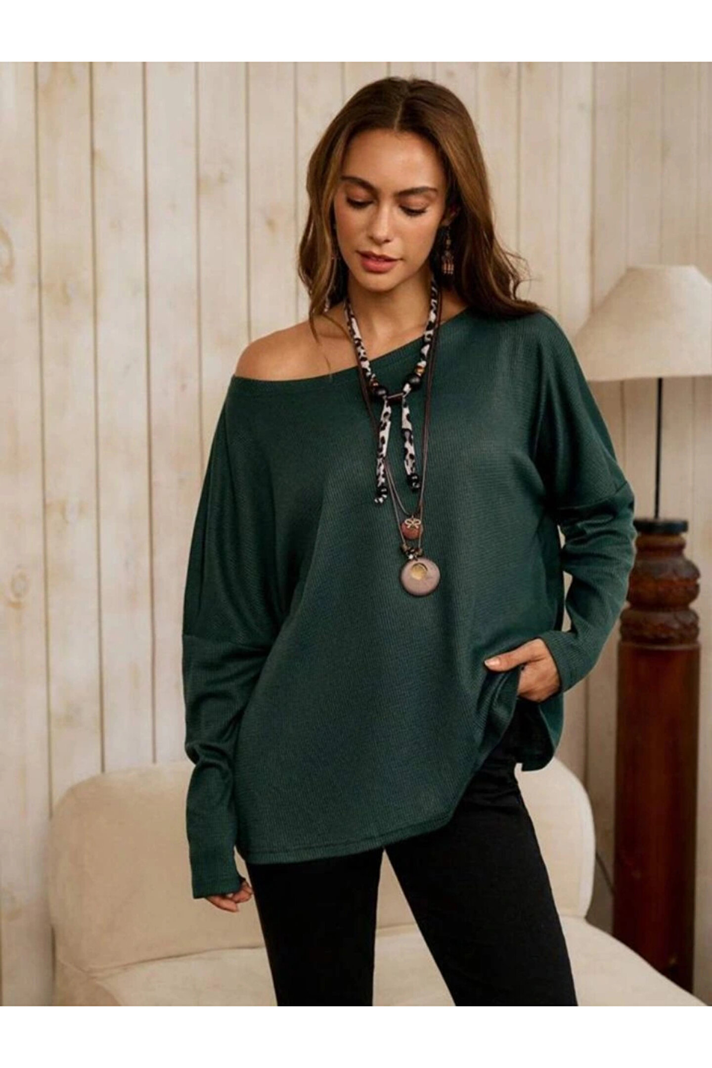 Kadın Tek Omuzdan Açık Yarasa Kollu Waffle Bluz