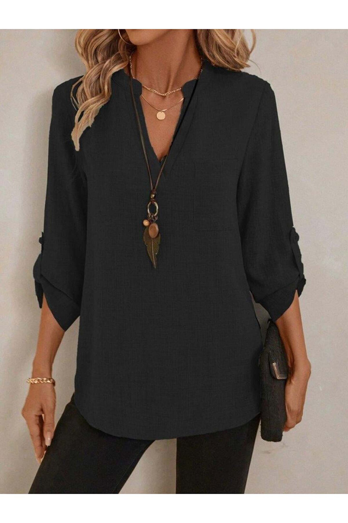 Kadın Truvakar Kol V Yakalı Keten Bluz