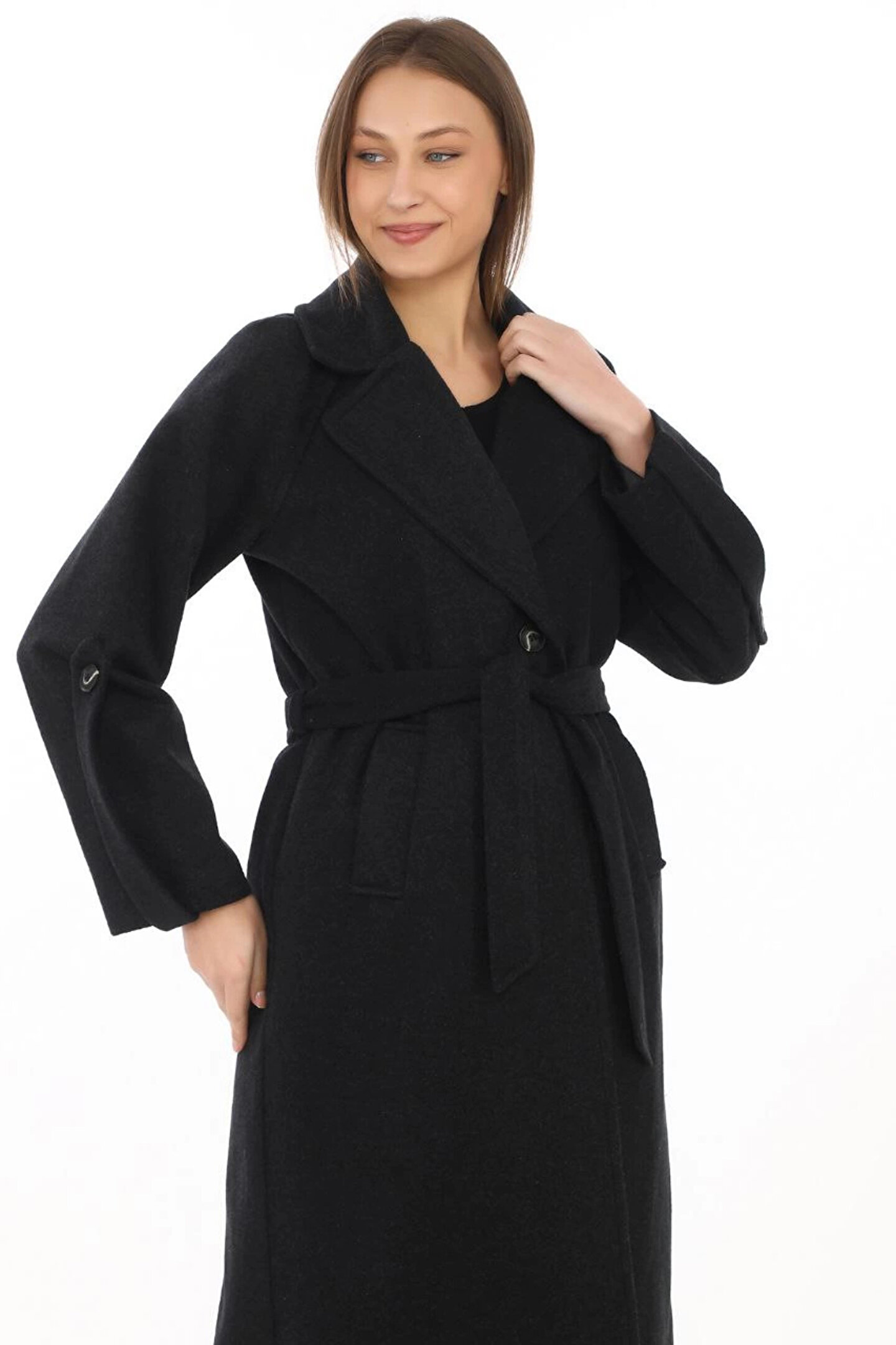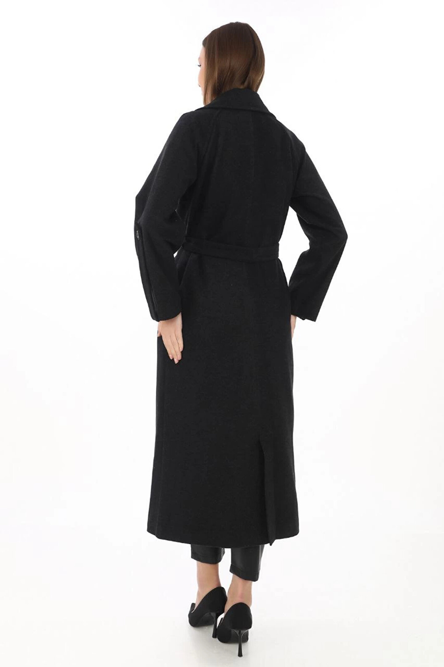 Uzun Kaşe Kaban – Yünlü Dokuma Kaşmir Kumaş, Kruvaze Yaka, Kuşaklı Astarlı Tesettür Uyumlu Şık Kışlık Siyah Model - Siyah
