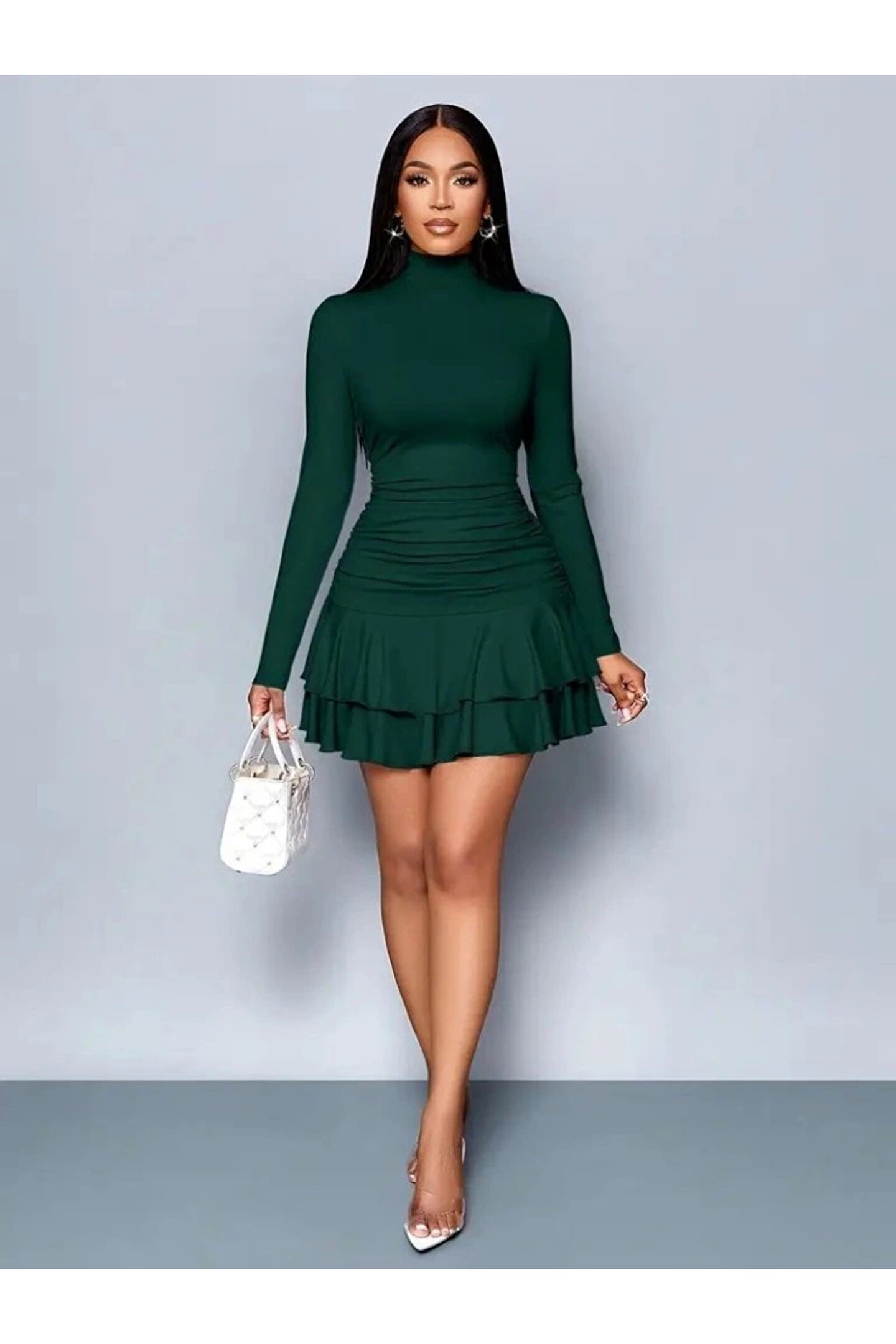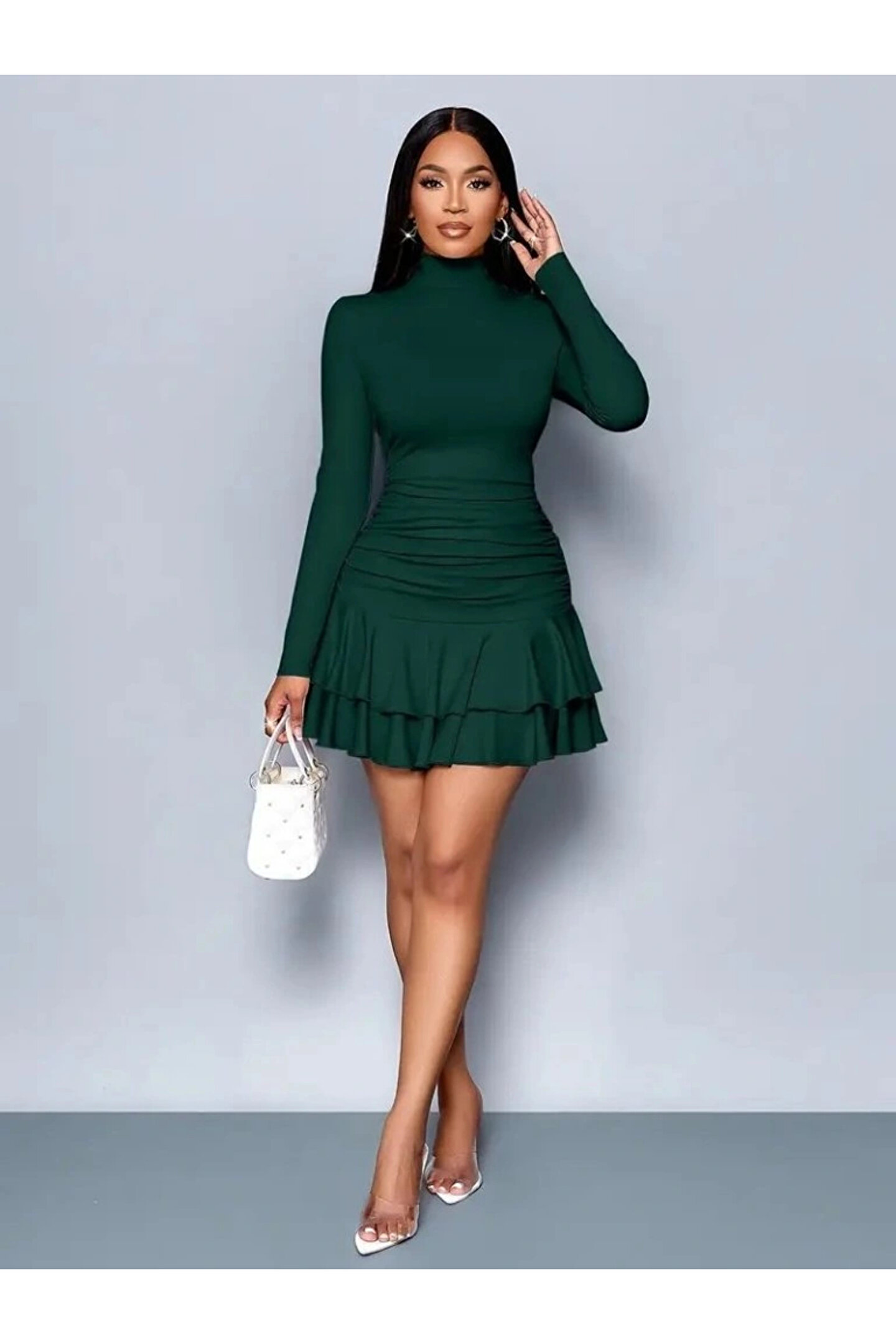 Kadın Uzun Kollu Balıkçı Yaka Mini Fırfırlı Sandy Elbise