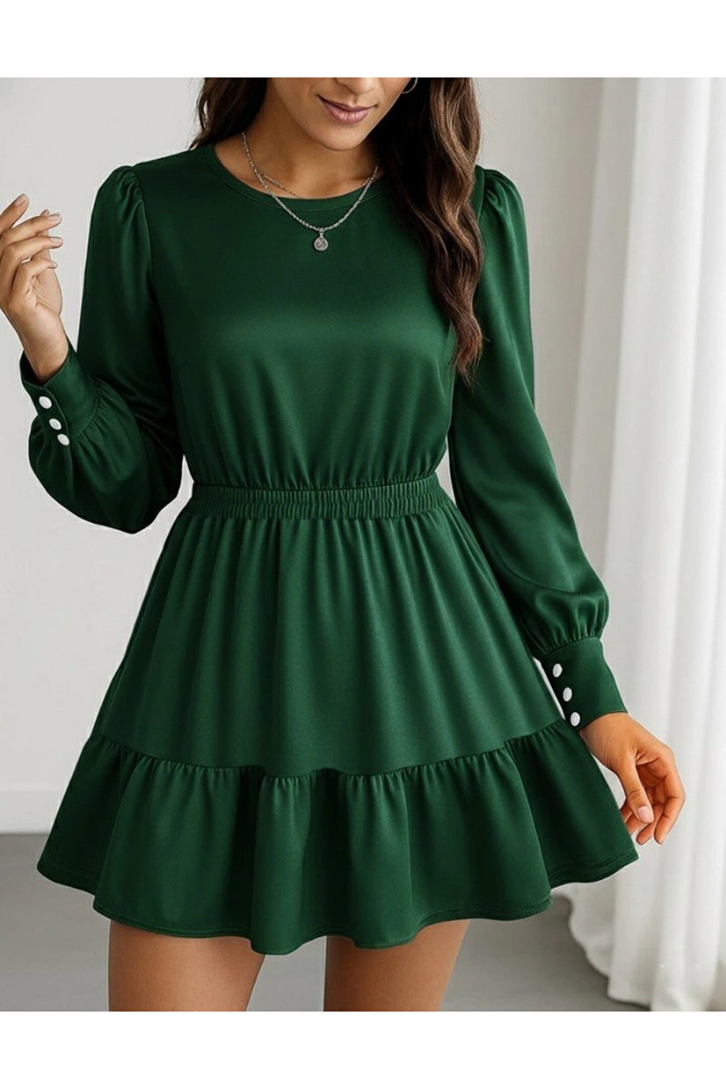 Silerra Kadın Uzun Kollu Bisiklet Yaka Beli Lastikli Fırfırlı Ithal Krep Elbise