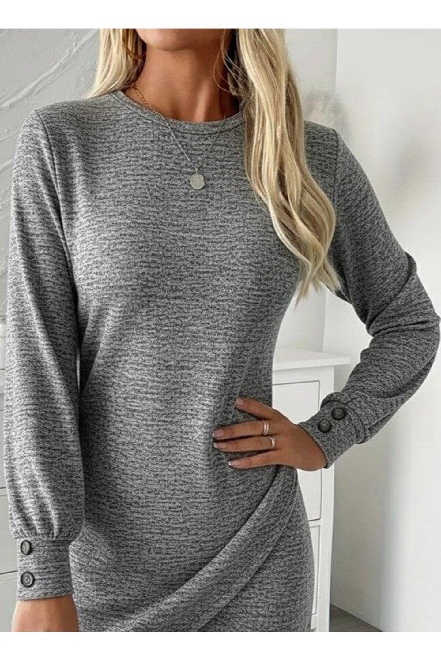 Kadın Uzun Kollu Bisiklet Yaka önden Asimetrik Kesim Detaylı Mini Yumoş Elbise