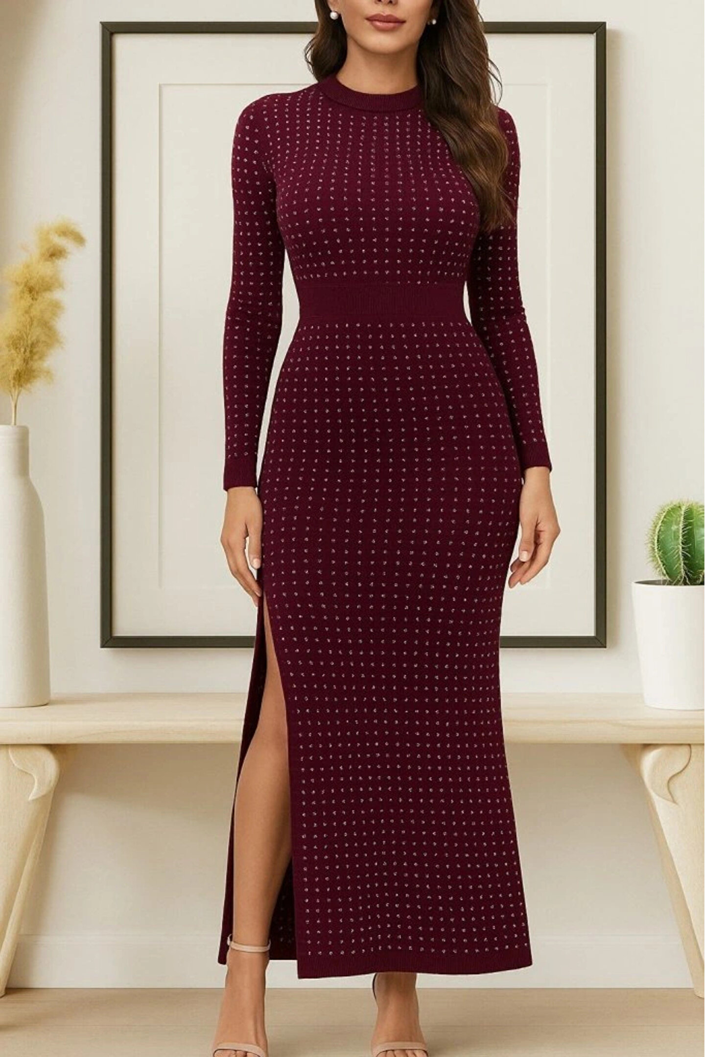 Silerra Kadın Uzun Kollu Bisiklet Yaka Taşlı Midi Kadife Elbise