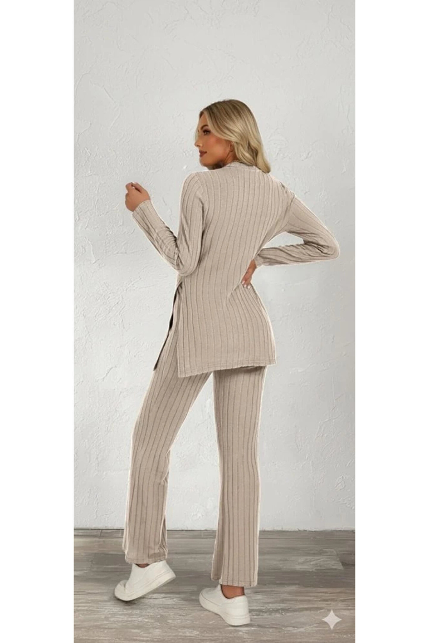 Kadın Uzun Kollu Bisiklet Yaka Yandan Yırtmaçlı şardonlu Kaşkorse Bluz Ve Pantolon Ikili Takım