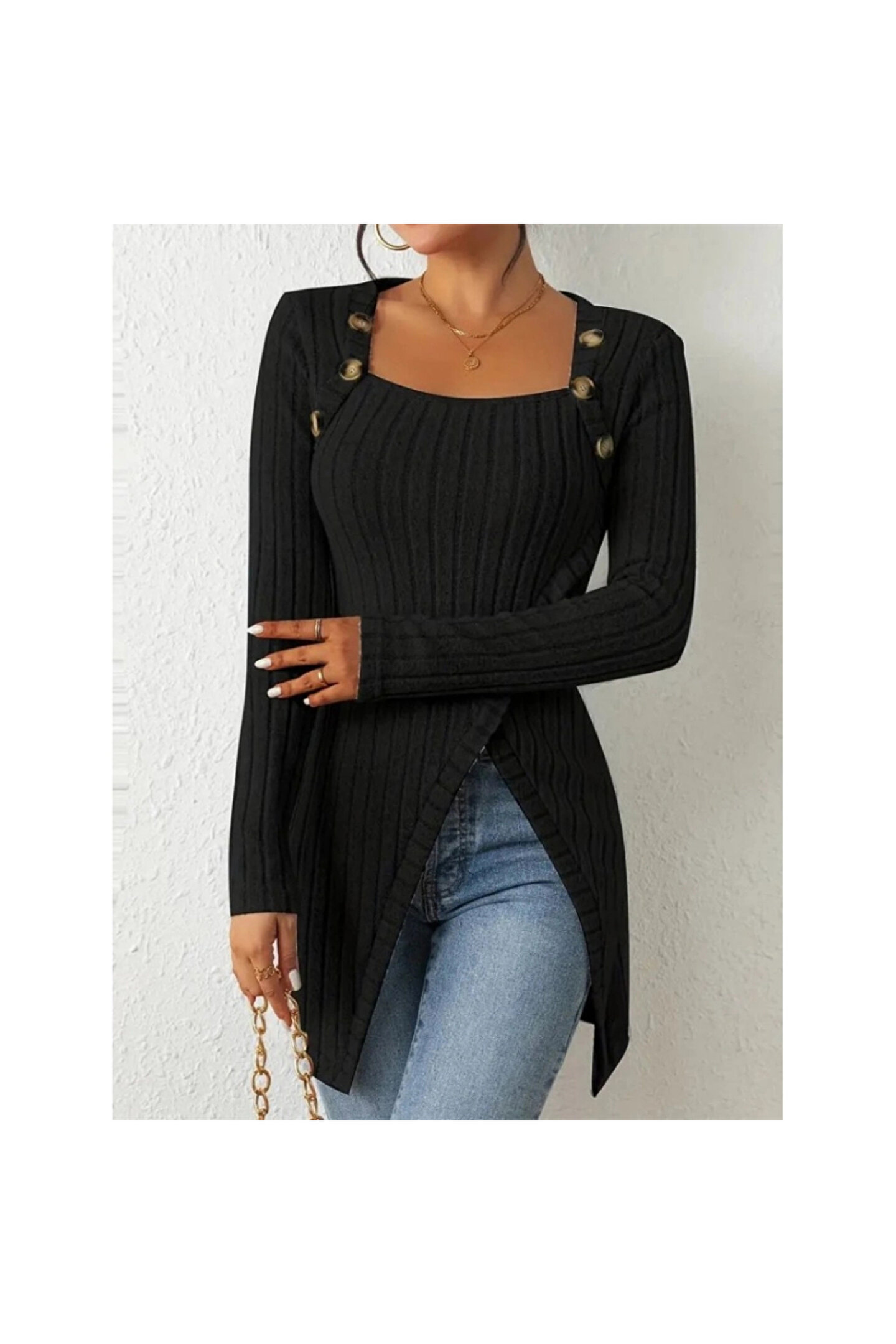 Silerra Kadın Uzun Kollu Derin Kare Yaka Düğme Detay şardonlu Kaşkorse Kruvaze Bluz