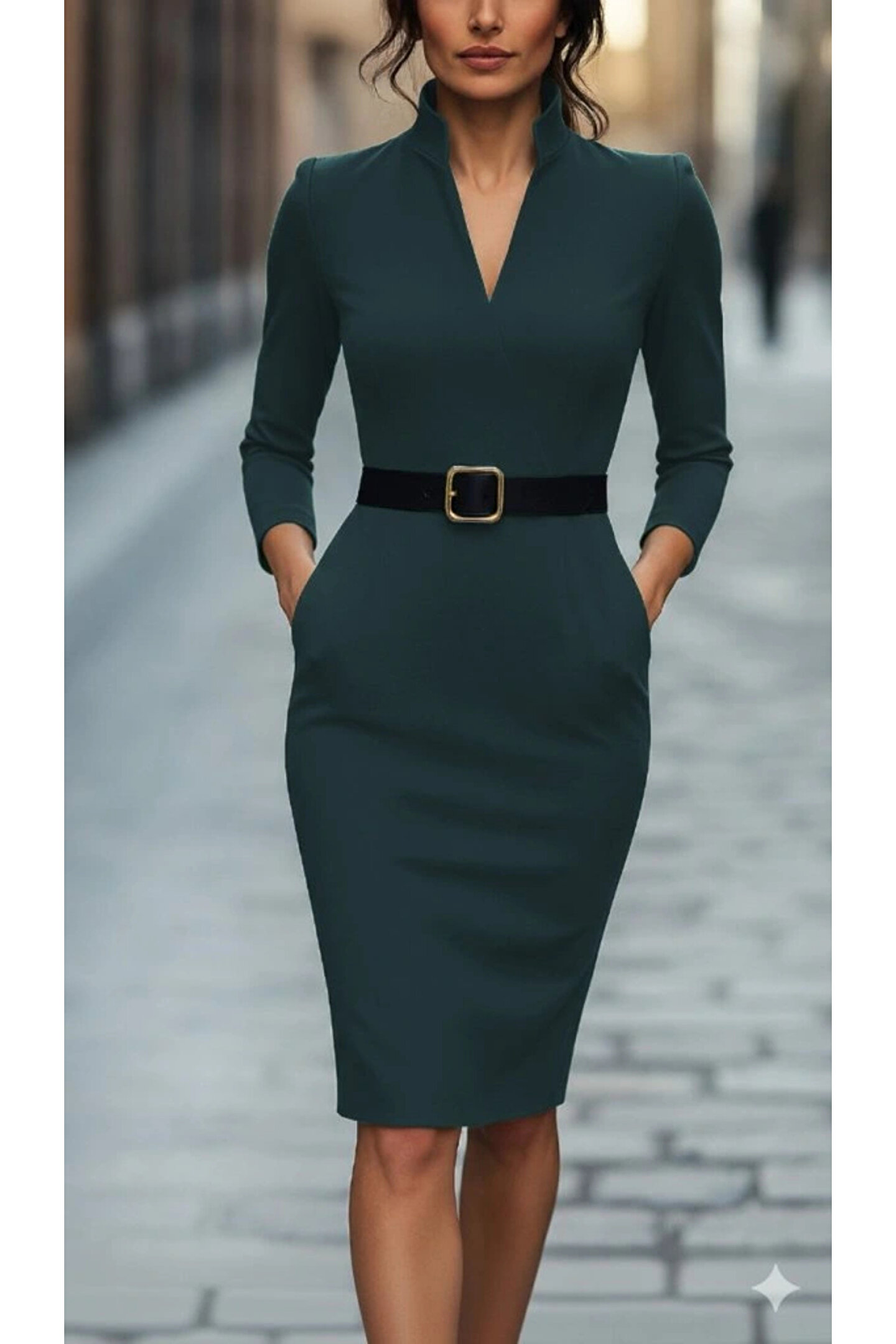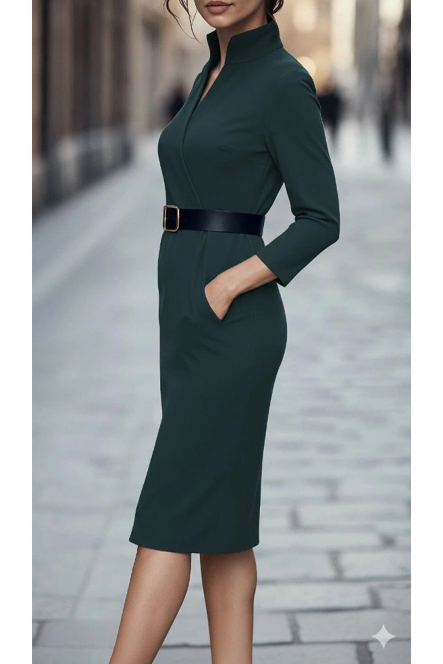Kadın Uzun Kollu Hakim Yaka Beli Kemerli Cepli Midi Ithal Krep Elbise