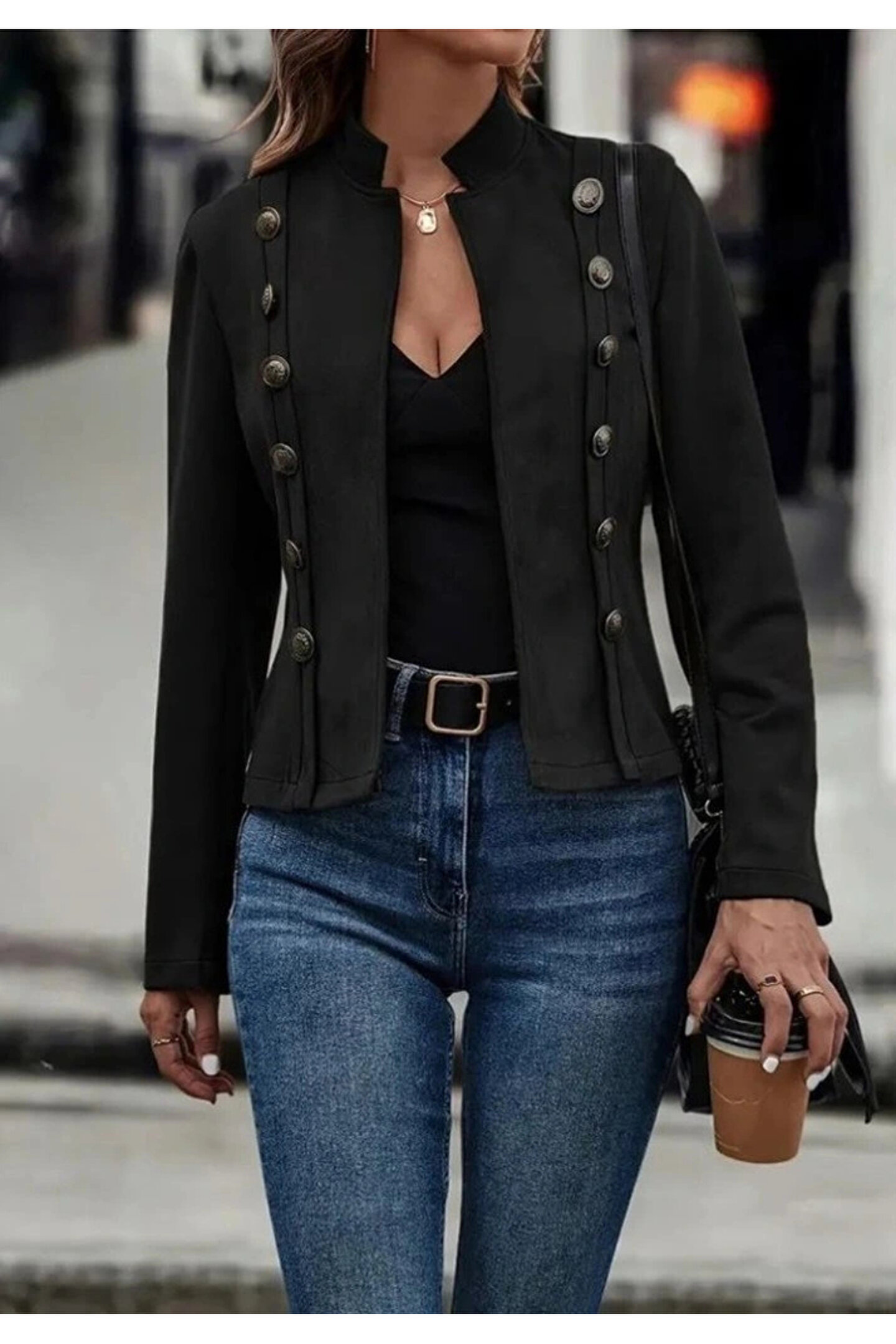 Kadın Uzun Kollu Hakim Yaka Yanlardan Düğmeli Kısa Süet Ceket