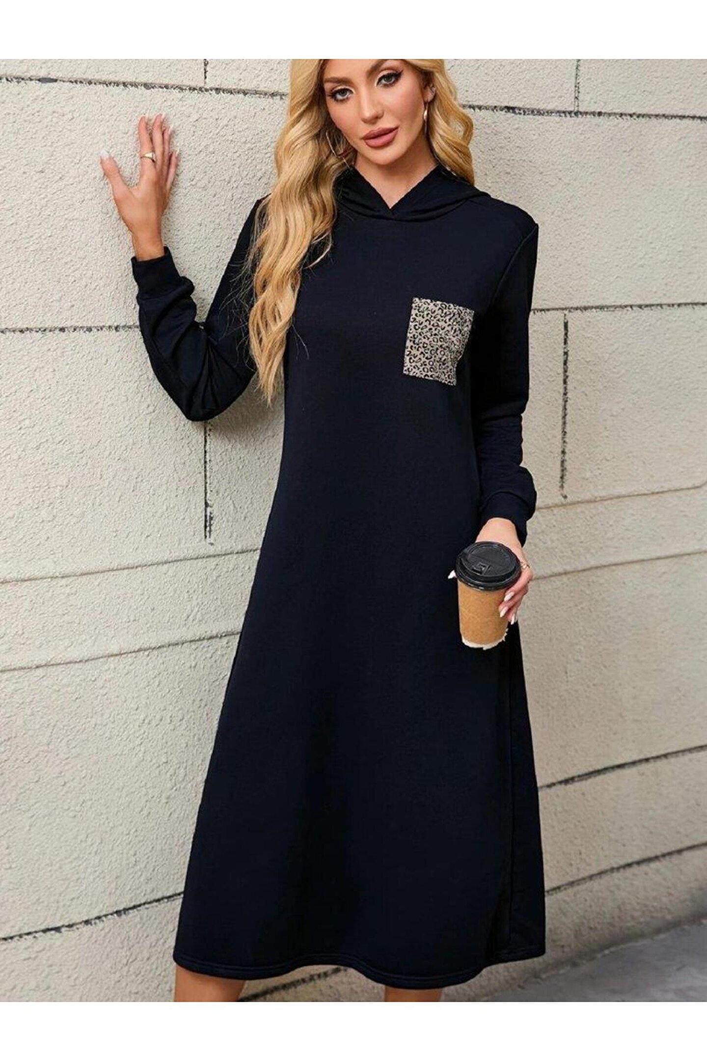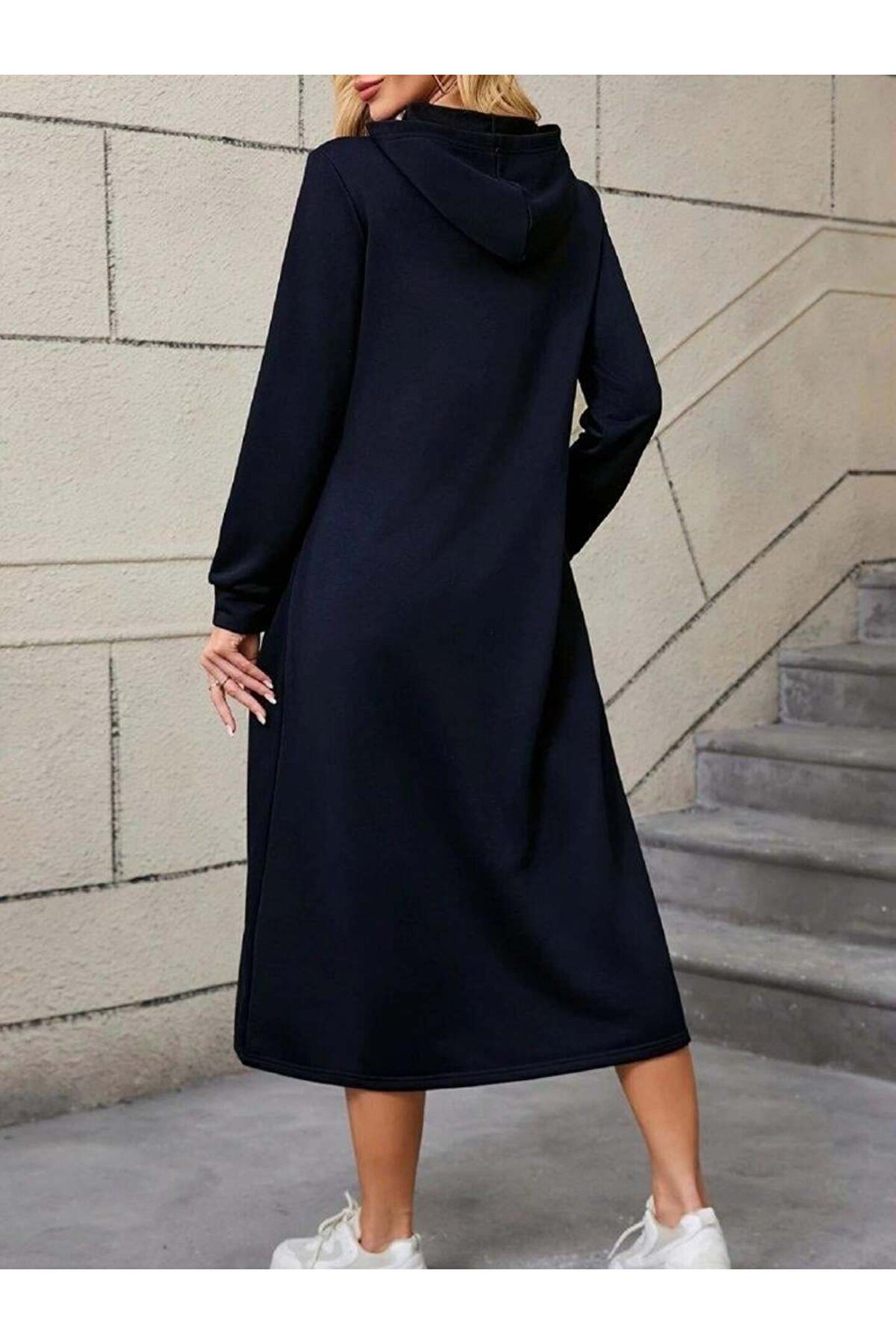Kadın Uzun Kollu Kapşonlu Cep Detaylı Viskon Iki Iplik Maxi Elbise