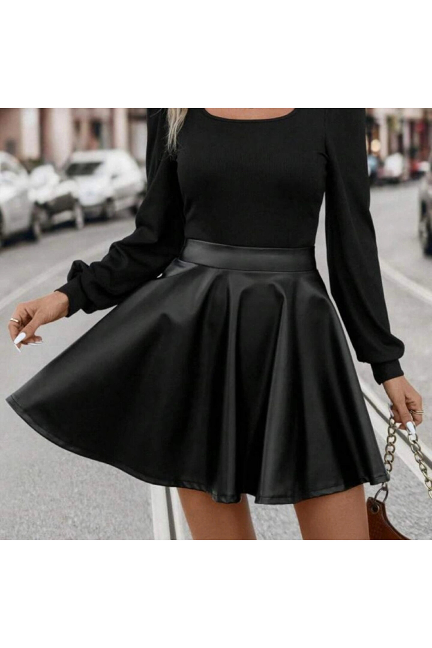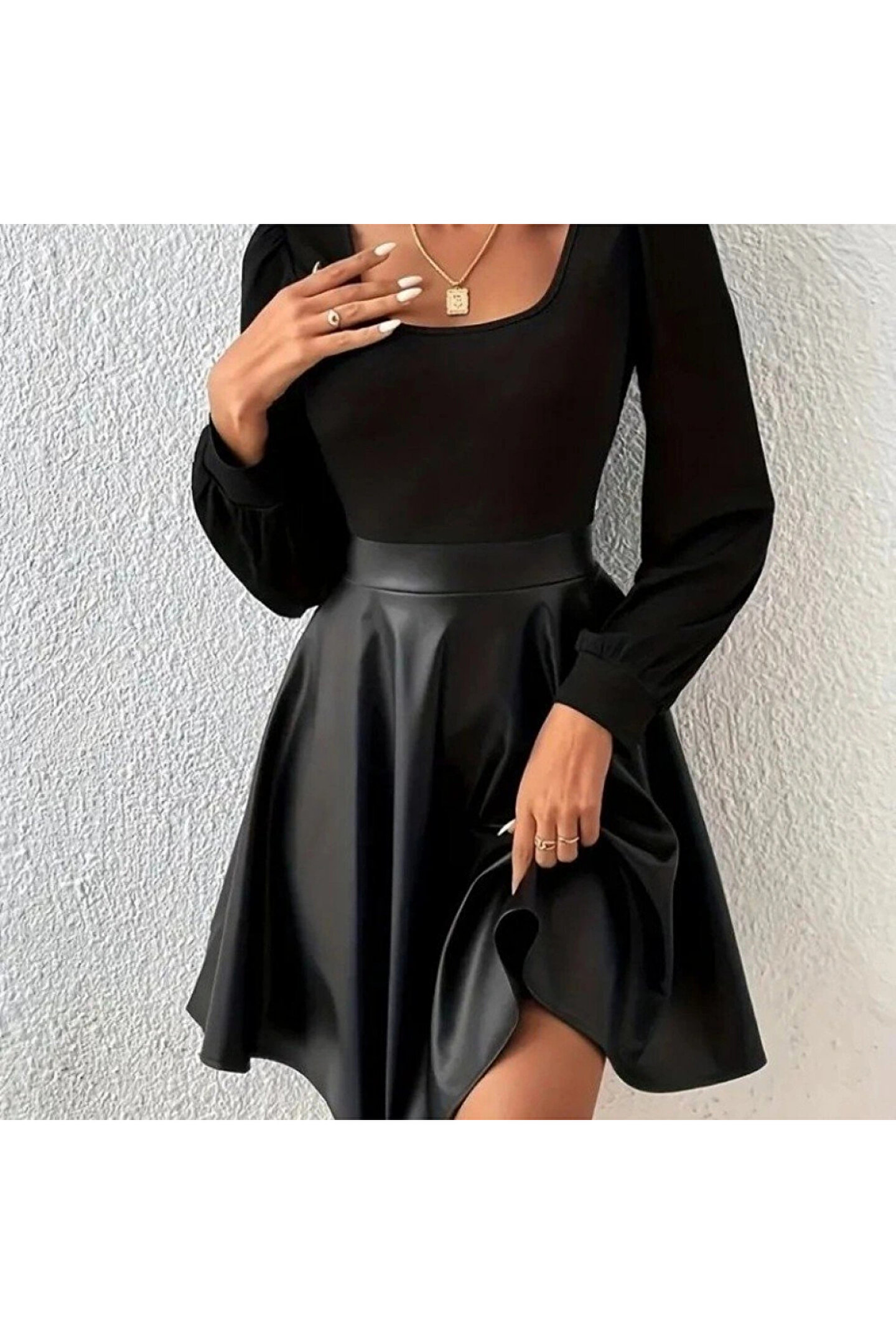 Kadın Uzun Kollu Kare Yaka üst Viskon Alt Deri Mini Elbise