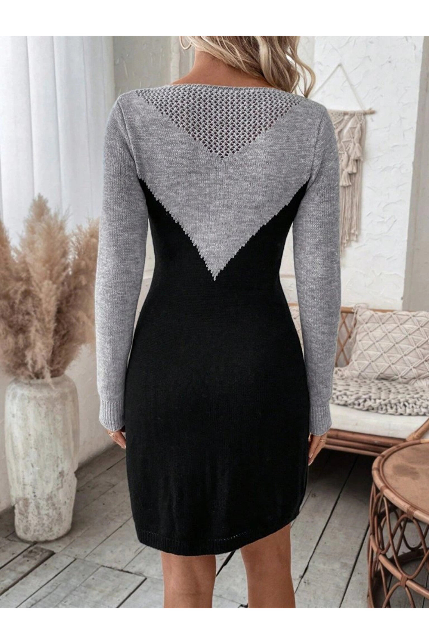 Kadın Uzun Kollu Kayık Yakalı çift Renk Mini Triko Elbise
