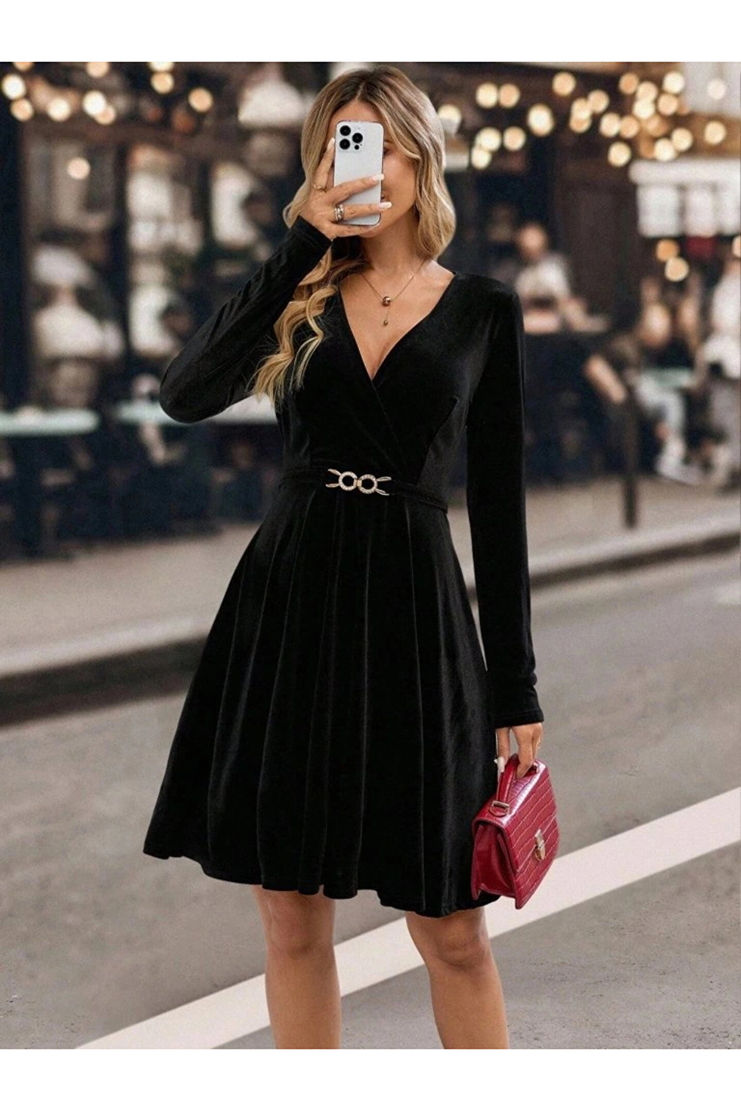Kadın Uzun Kollu Kruvaze Yakalı Toka Detaylı Mini Kadife Elbise