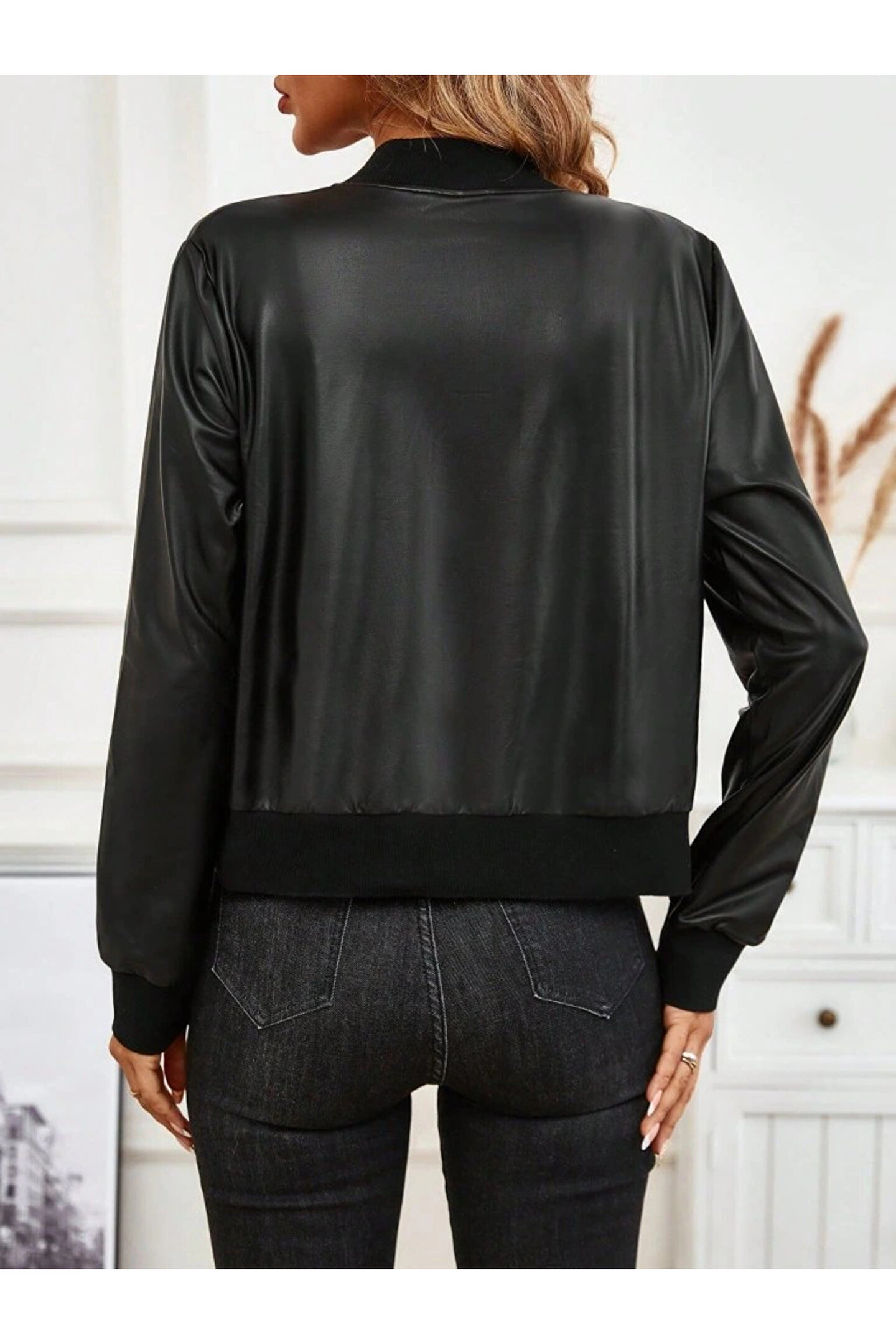 Kadın Uzun Kollu önden Fermuarlı Deri Kısa Ceket