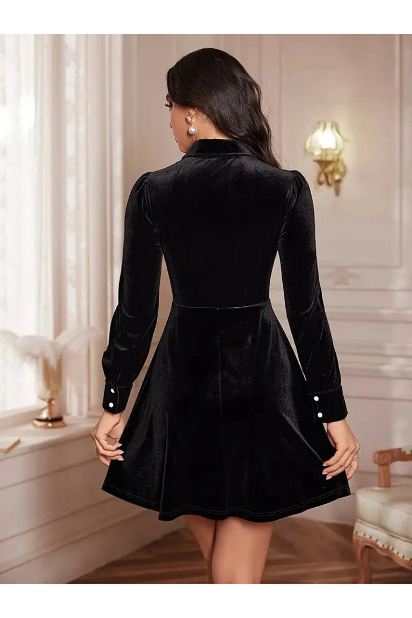 Kadın Uzun Kollu Yakalı Tül Detaylı Incili Mini Kadife Elbise