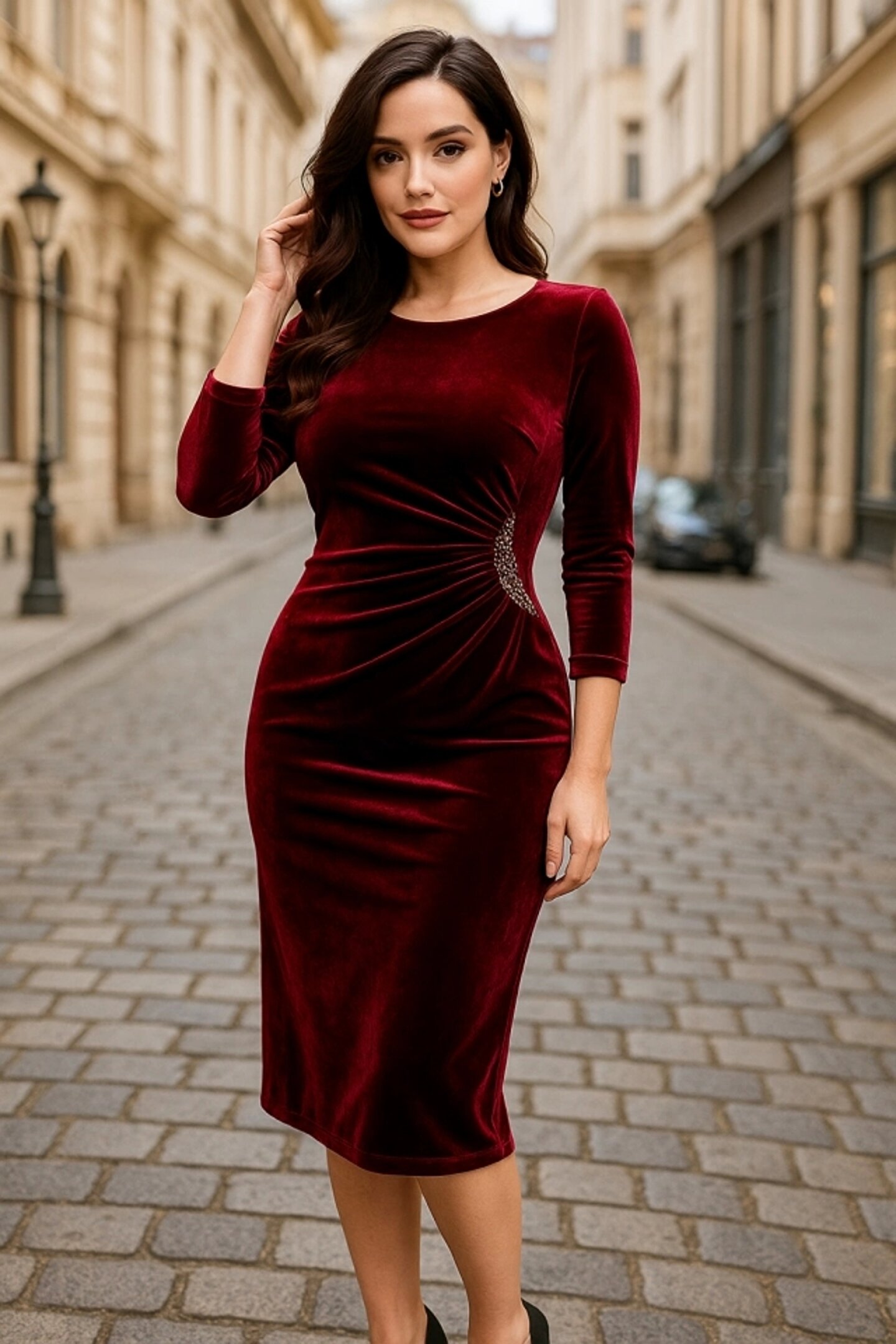 Kadın Uzun Kollu Yakası Açık Yanlardan Büzgülü Taş Detaylı Midi Kadife Elbise