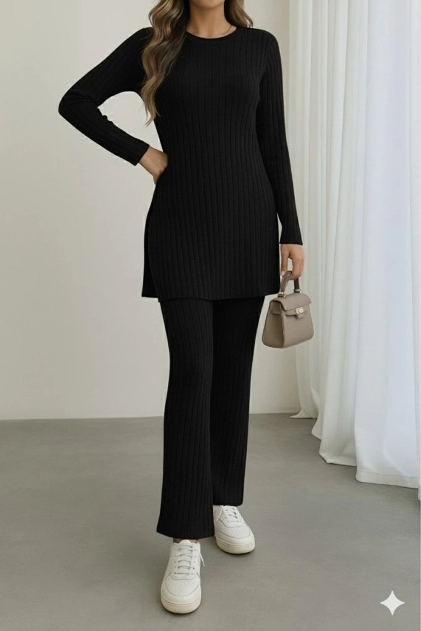 Silerra Kadın Uzun Kollu Yuvarlak Yaka Yandan Yırtmaç Detaylı şardonlu Kaşkorse Bluz Ve Pantolon Ikili Takım