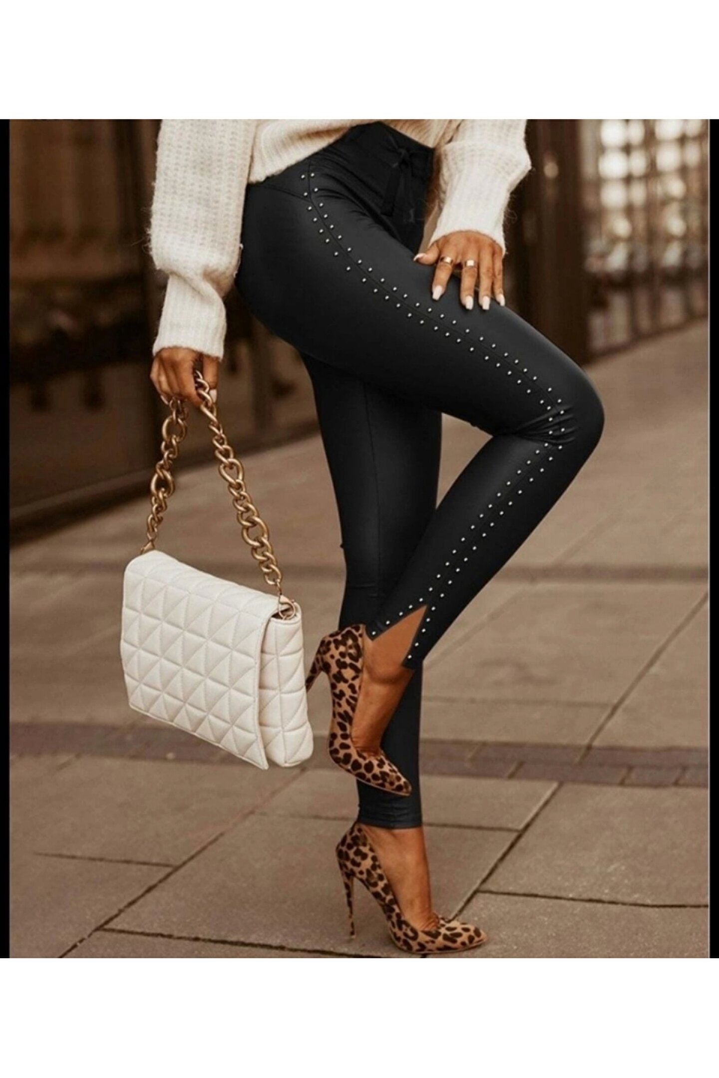 Kadın Yüksek Bel Yanlardan Incili Yırtmaçlı Uzun Deri Tayt