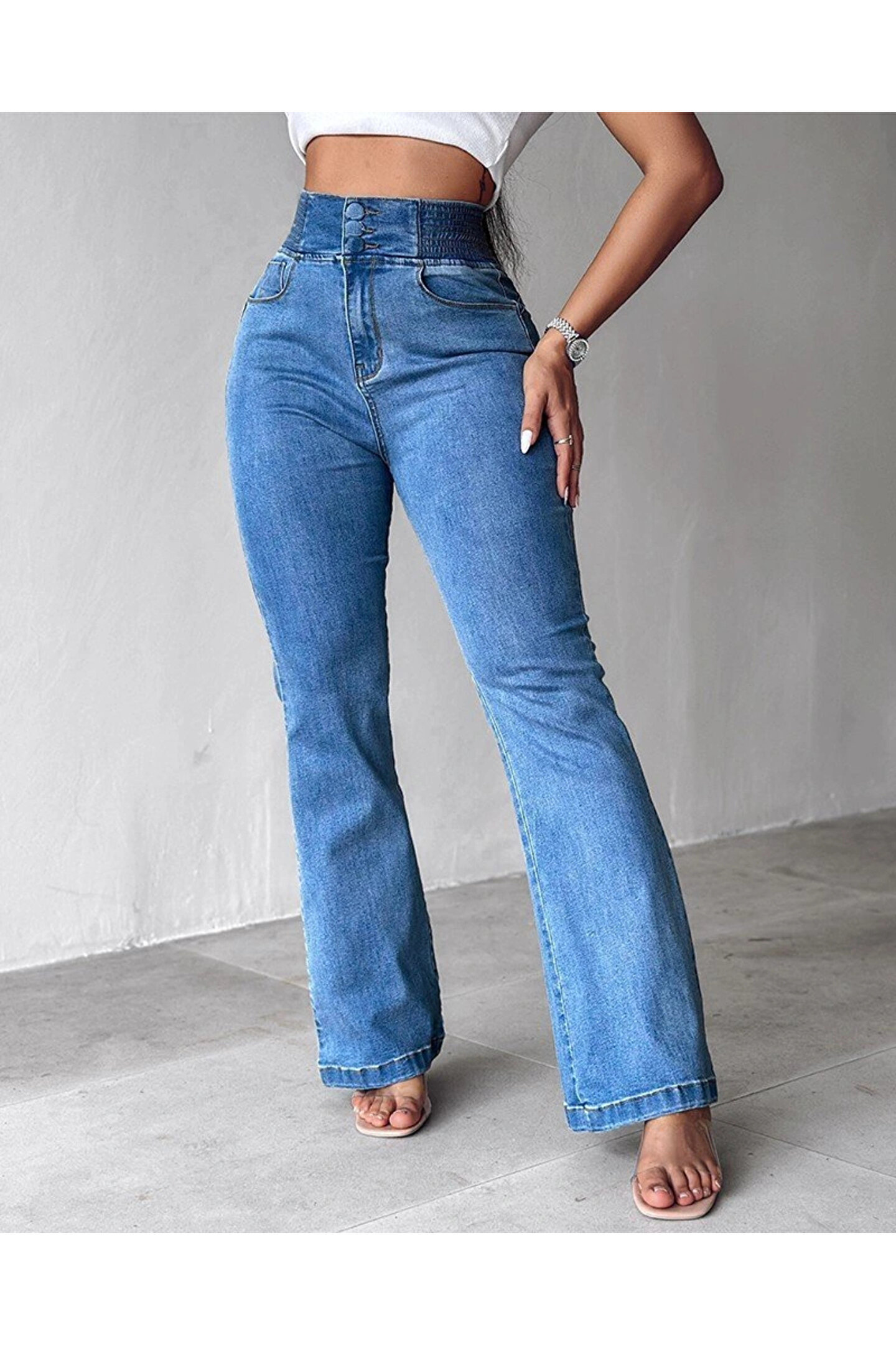 Kadın Yüksek Bel Yanları Lastik önü Düğmeli Kot Pantolon